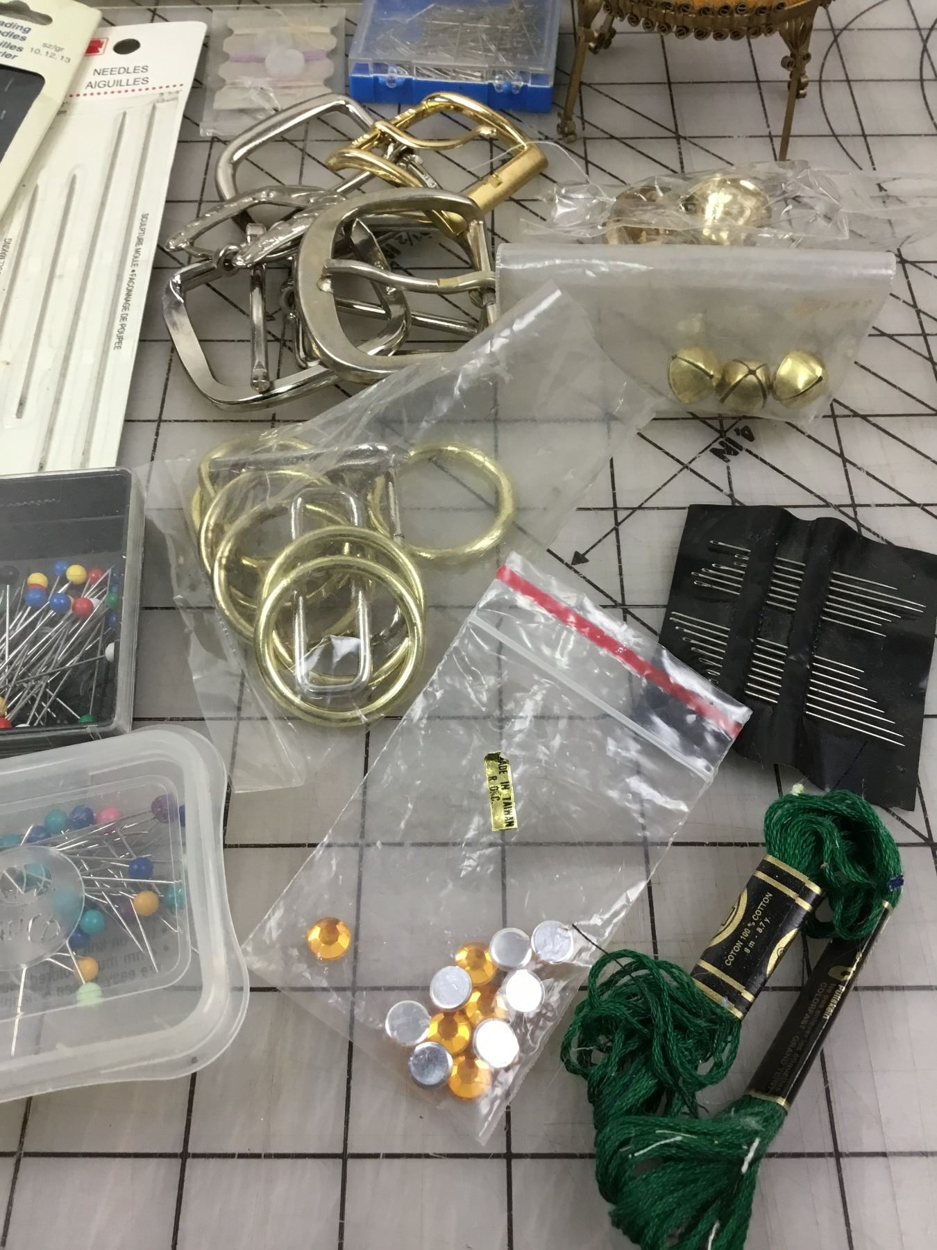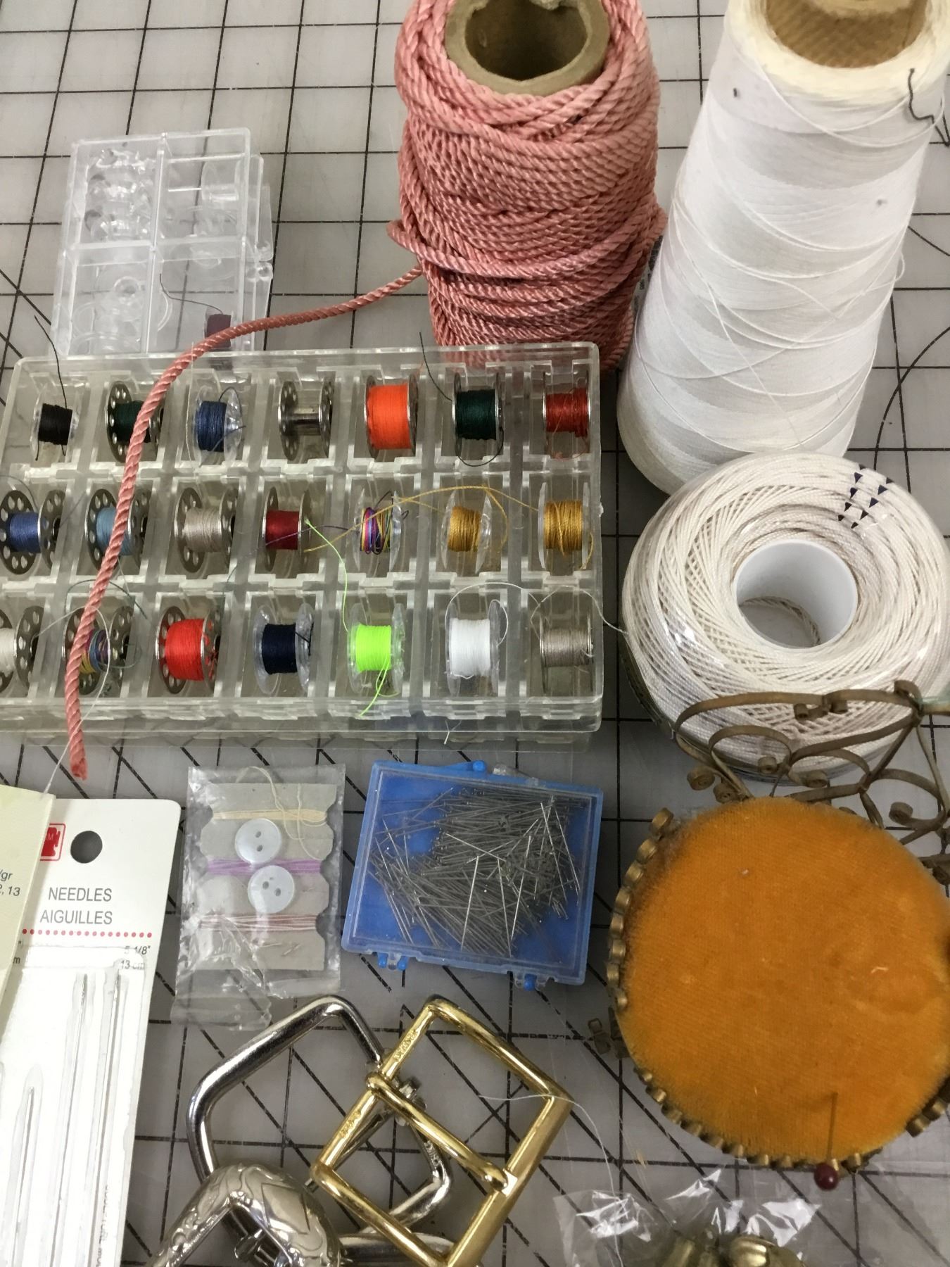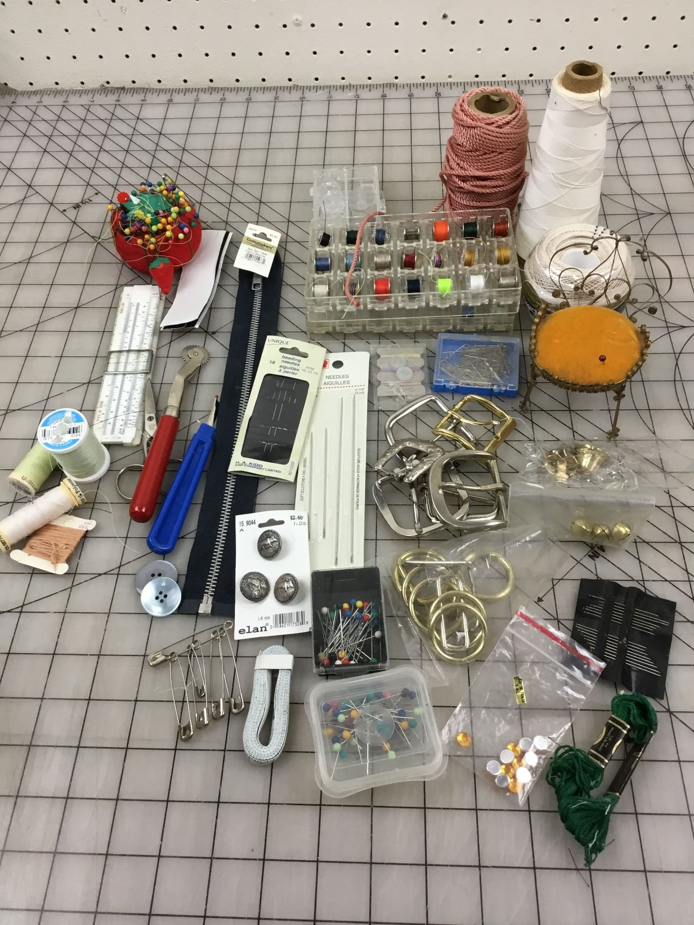 LOT OF SEWING CRAFT SUPPLIES BELT BUCKLES THREAD PIN CUSHIONS TOOLS ETC