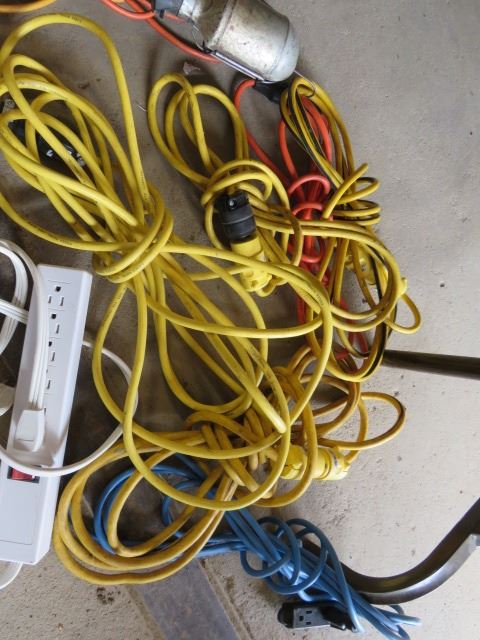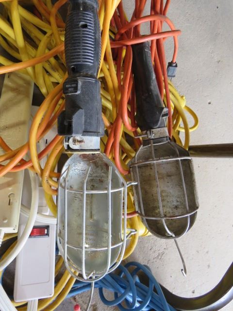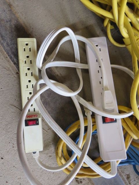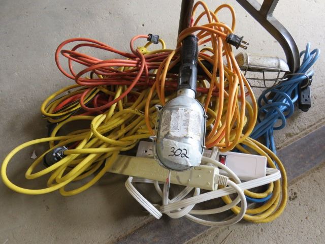 LOT OF SHOP SUPPLIES (2 X TROUBLE LIGHTS, 2 X POWER BARS, 6 X EXTENSION CORDS)