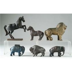 LOT OF SIX C.I. ANIMAL STILL BANKS. Lot includes a blue standing circus elephant, a standing buffalo, a large gold standing lion, a blue standing elephant, a larger rearing horse on platform, and a black “BEAUTY” standing horse. SIZE: Tallest 7” t. CONDITION: Most of lot has little to fair paint, gold lion is good. WP 1-3346-1172 (200-400)