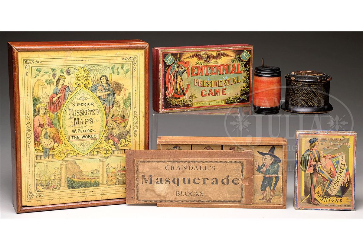 1) "Game of Costumes and Fashions" by Milton Bradley, 1881. Colorful chromolithographed card game shows dozens of different Victorian costumes. 2) Crandall's "Masquerade Blocks". Six-sided paper on wood blocks show hand painted caricatures in masquerade costumes. Circa 1860s. 3) "World Dissected Maps" by Peacock, London. Paper on wood jigsaw puzzle with hand painted features on game cover and puzzle pieces. 4) "Centennial Presidential Game" by McLoughlin Bros., 1876. Game pieces include instruction booklet, printed cards, double arrow spinner, and tally cards. Box cover has really great Americana graphics with early eagle and George Washington depictions. 5) Early Clark's Mile End Spool Game also known as "Game of Forfeits". Unusual canister-like toy spins to reveal your task. 6) Wooden barrel with crank was apparently a noise maker (no longer doing so). SIZE: Largest 11" l. PROVENANCE: The Diane and late Steve Olin collection. CONDITION: Averaging good plus. 13271-42