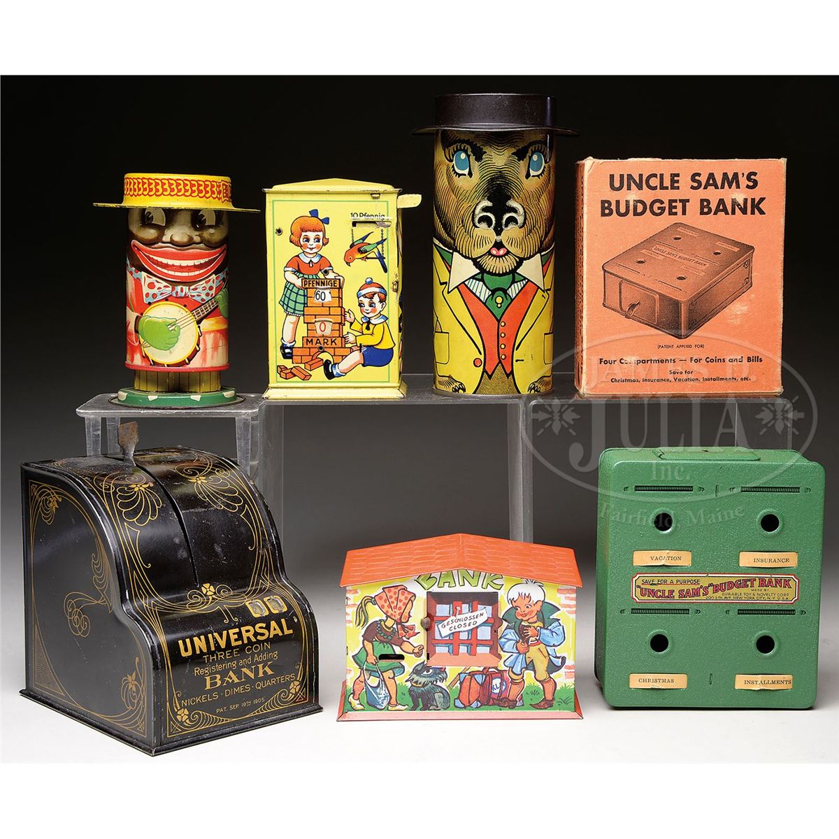 1) Colorful West Germany mechanical house bank shows child at counter accepting money. Insert coin, push tray, and money disappears into bank. Original trap and key. 2) Copyright 1905 Register coin Bank by Shonk, Chicago. Deposit coin, swing lever down to tally total amount of coins deposited. 3) Desirable Black Man growing bank - England. Remove hat, deposit coins, and bank grows in height with weight of money. Depicts Black Man with exaggerated facial features strumming banjo. 4) Circus Dog tin bank. Originally contained Mallow Puff candy, then doubled as tin coin bank. 5) German tin coin Register bank. Colorful tin litho showing children at play. Insert coin, slide lever, and bank tallies deposited amount. Retains trap. 6) Uncle Sam's Budget Bank in original box by Durable Toy Co., N.Y. Facade of bank shows four different windows for keeping tally on accumulated coins. Each compartment was designated for a different budget. SIZE: Largest 7" t. CONDITION: Lot is very clean averaging very good plus. All mechanical functions working. 1-13285