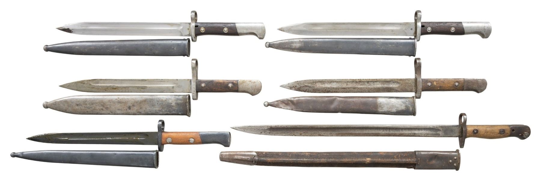 This lot consists of the following bayonets: 1) Steyr made 1895 Chilean Mauser bayonet with mismatched but correct scabbard. CONDITION: grip panels show some dings & small cracks. Metal parts of bayonet are varied silvery-gray colors with some light chipping along blade, scattered oxidation, dings & light pitting. Scabbard shows scattered edge wear & oxidation. 2) Yugo M48 Bayonet. Matching scabbard present. CONDITION: metal shows light wear, dents & oxidation with cosmoline still present. Grip panels show some handling wear & marks. 3) Steyr made 1895 Chilean Mauser bayonet with mismatched but correct scabbard. CONDITION: grip panels show some dings & handling marks. Metal parts of bayonet are varying shades of silver & gray with oxidation, dried grease & handling marks. Scabbard is dull gray color with some edge wear, oxidation & moderate dents. 4) Australian P1907 bayonet.. 1944 dated & "OA" marked P1907 bayonet with scabbard. CONDITION: grips appear sanded with gouges, dings & stains. Metal parts of bayonet are varied gray colors with oxidation & dings. Scabbard shows dents, cracks, crazing & overall flaking. 5) Turkish M1935 Bayonet. Crossguard is numbered "10357". Bayonet & scabbard otherwise appear unmarked. Blade appears sharpened. CONDITION: wooden handles show scattered staining, dings & dents. Metal parts of bayonet are a gray patina with oxidation, dings & dried grease. Scabbard is mostly gray with oxidation, dings, pitting & traces of arsenal blue. 6) Turkish M1935 Bayonet. Pommel marked "ASFA" & "221". CONDITION: grip panels show several dents, some staining & handling wear. Metal parts of bayonet are a gray patina with oxidation, dings & edge wear. Scabbard shows heavy dents, oxidation, edge wear & some scratches. (02-24127/MJC). NON-GUN. $300-500 for lot.