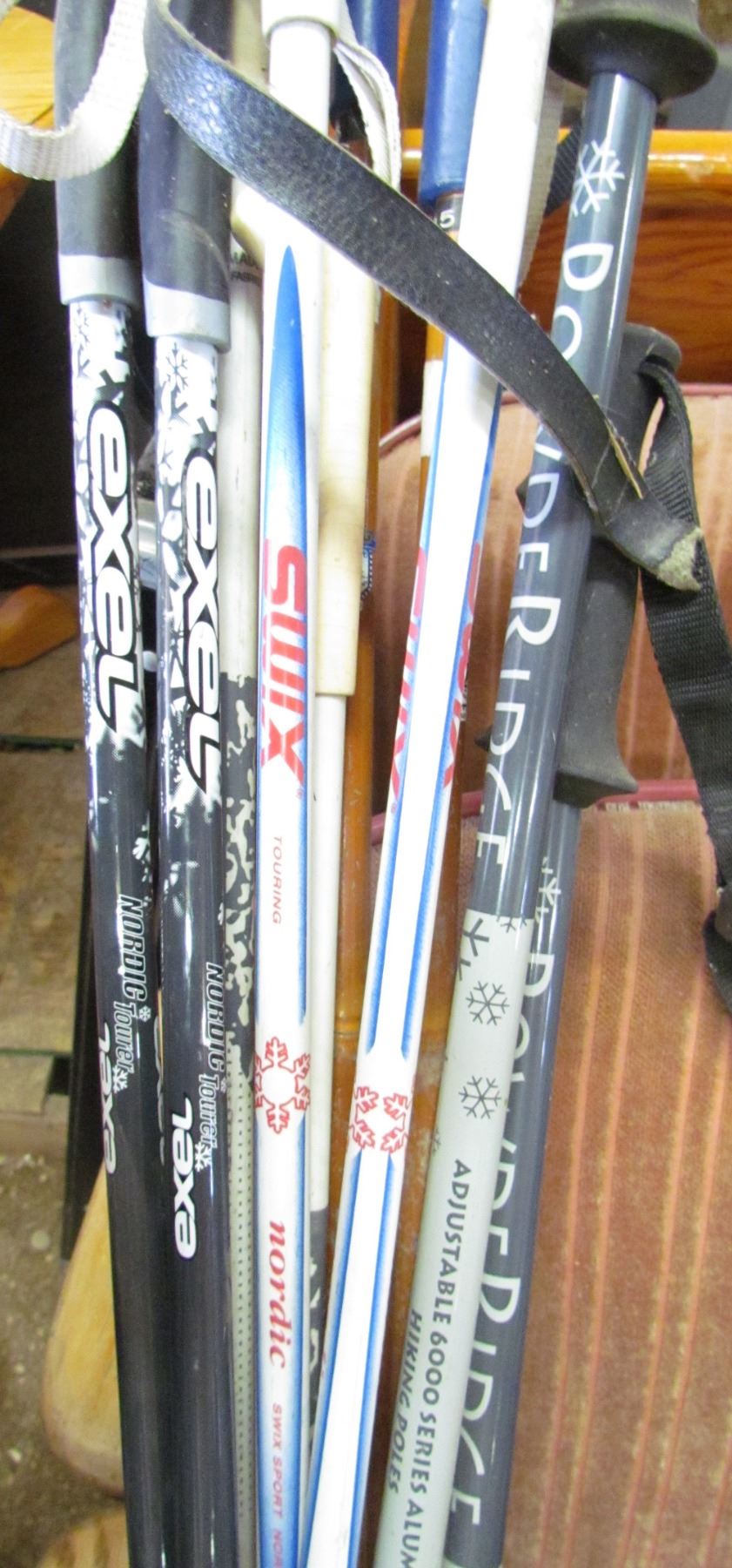 LOT OF SKI EQUIPMENT (2 X SKIS; GREEN AND WHITE 6.5' LONG, RED 6' LONG) *4 X PAIRS OF POLES*