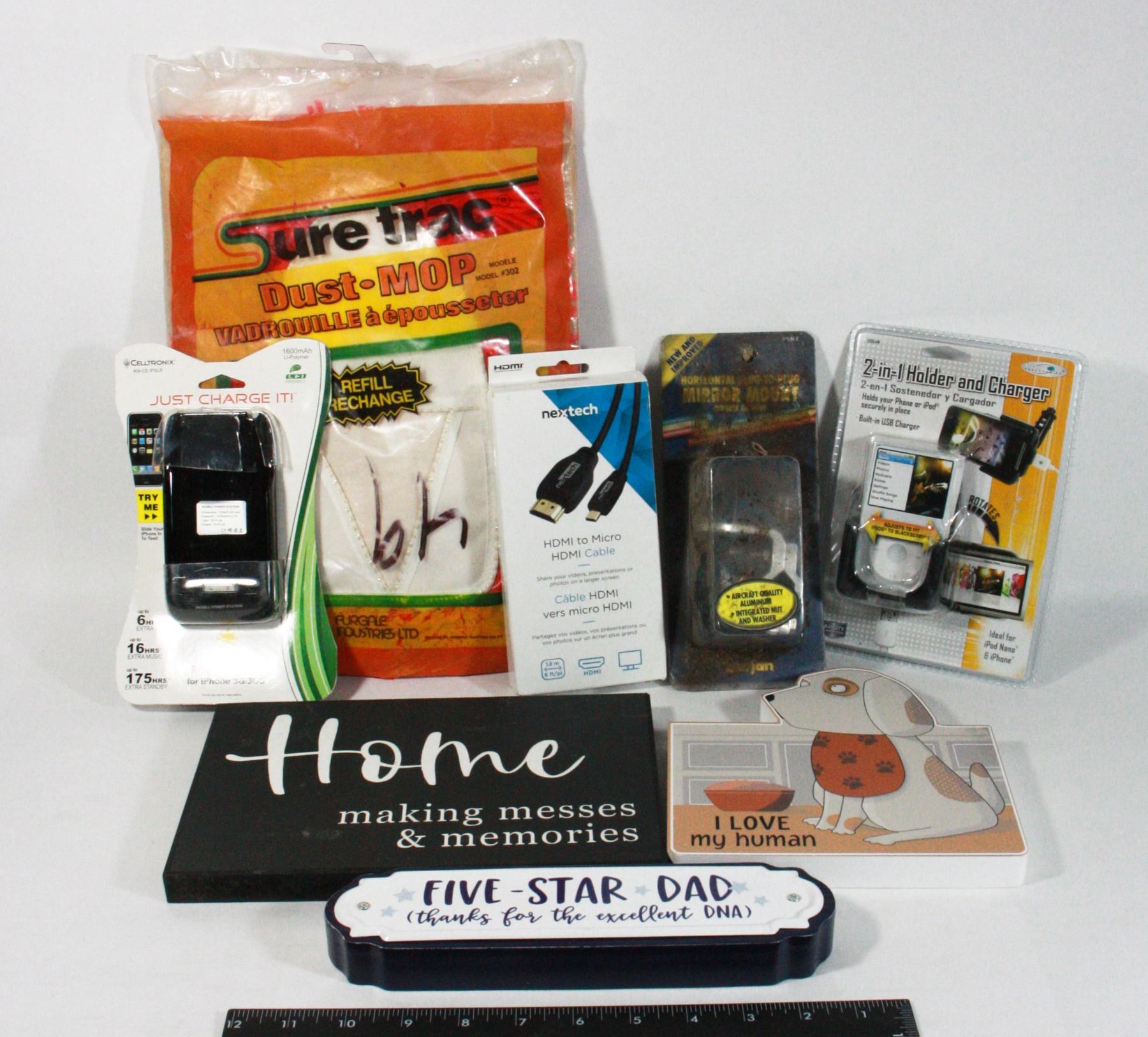 LOT OF SMALL SIGNS, CHARGERS, DUST MOP ETC.