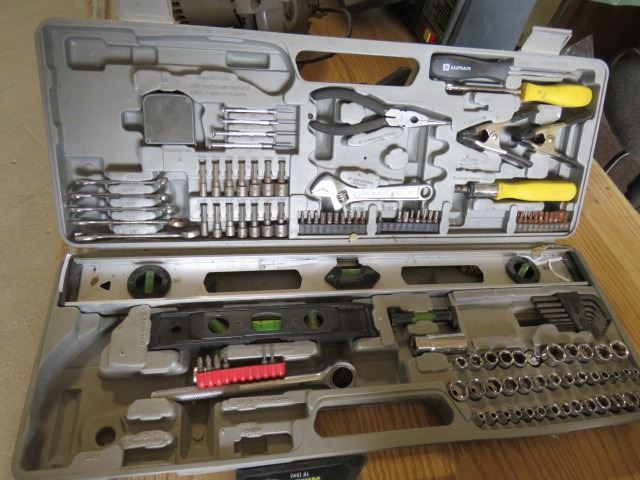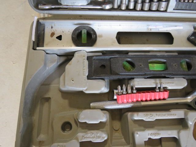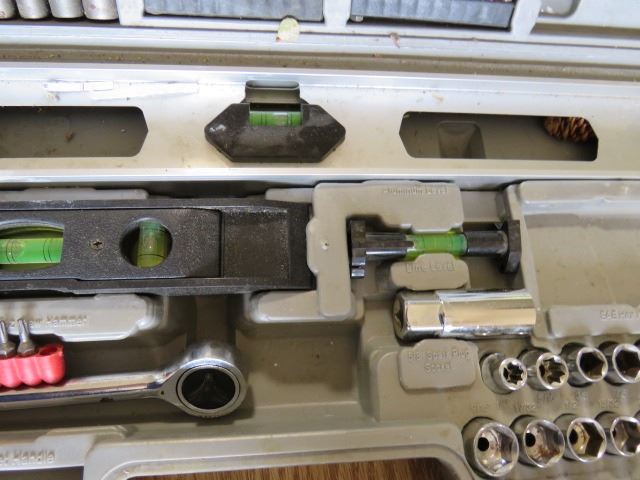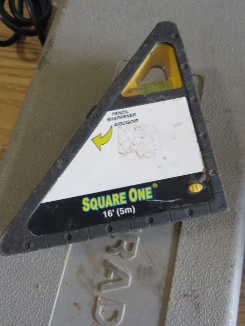 LOT OF SMALL TOOLS (SQUARE ONE MEASURE, LEVELER, TOOL KIT) *MISSING HAMMER AND CUTTING BLADE*