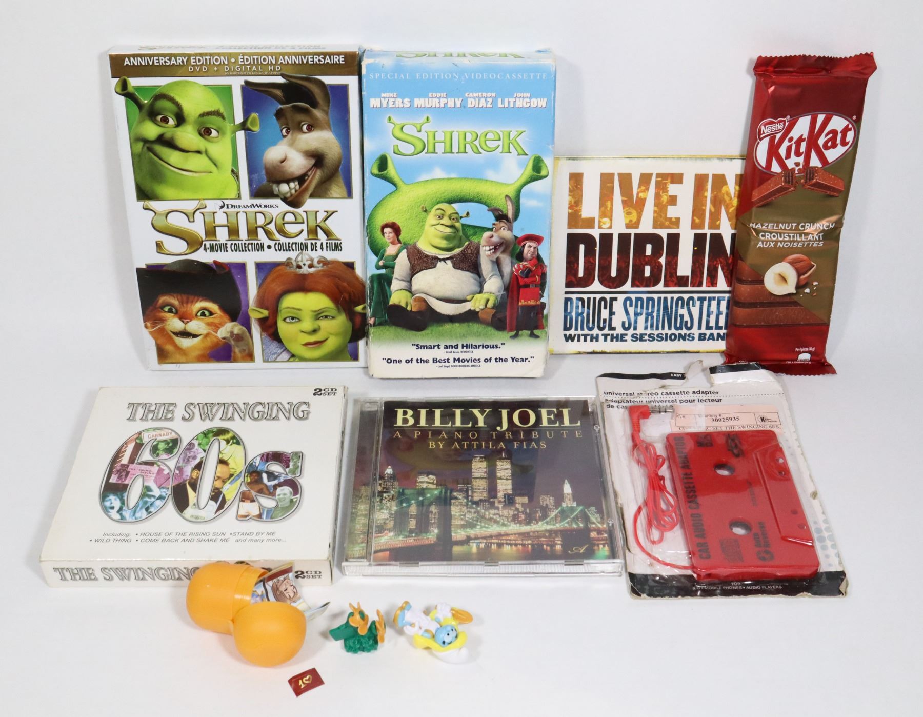 UNIVERSAL STEREO CASSETTE ADAPTER, MUSIC CDS, HAZELNUT CRUNCH KITKAT (EXPIRES NOV 25 2023), AND OTHERS