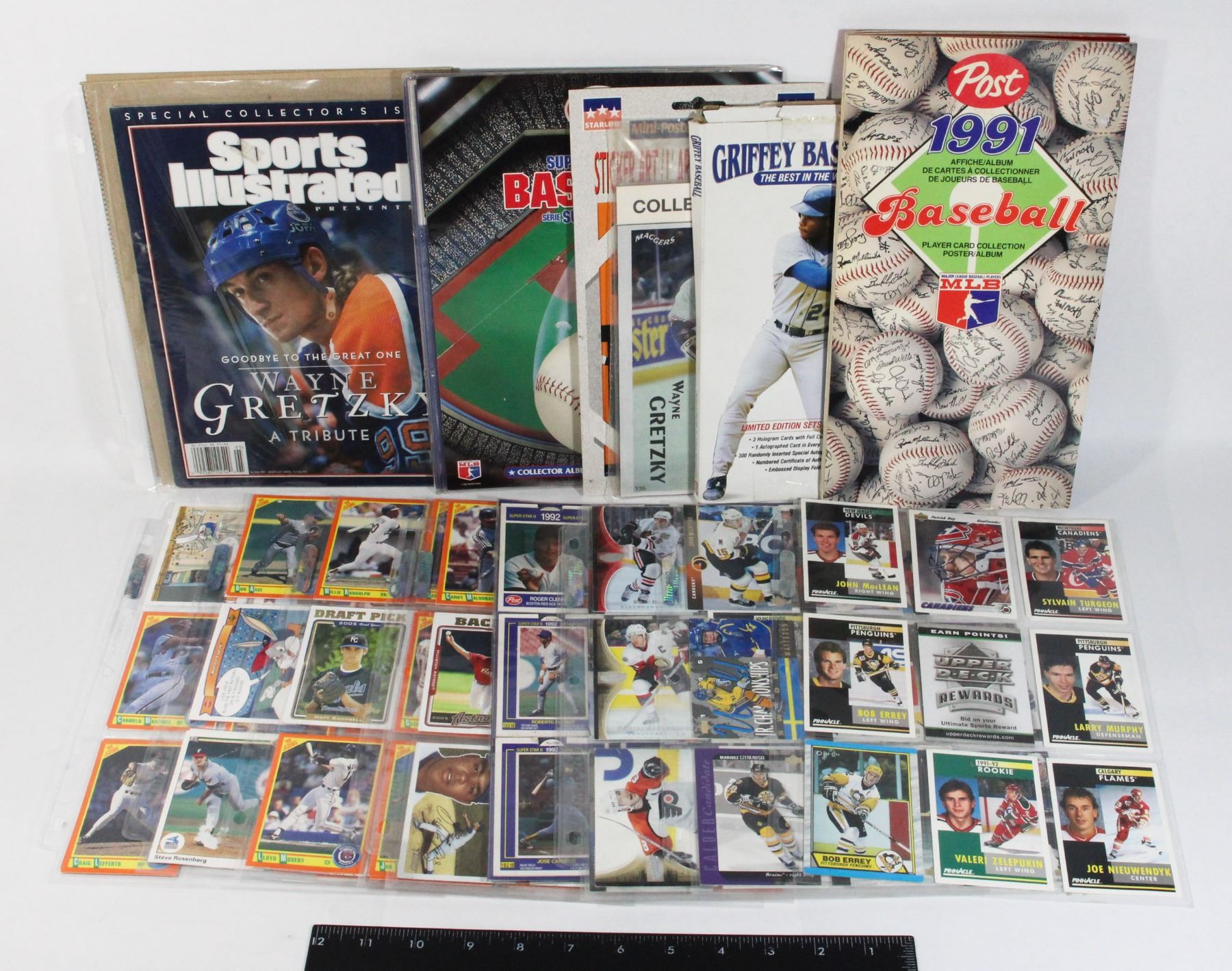 COLLECTION COMPLETE, ERIC LINDROS MINI POSTER, LEMIEUX AND GRETZKY MAGNETS, SPORTS ILLUSTRATED GRETZKY SPECIAL, KEN GRIFFEY THREE HOLOGRAM CARDS WITH COA & POST 1992 PARTIAL SET CARDS. TEN SHEETS OF MIXED SPORTS CARDS