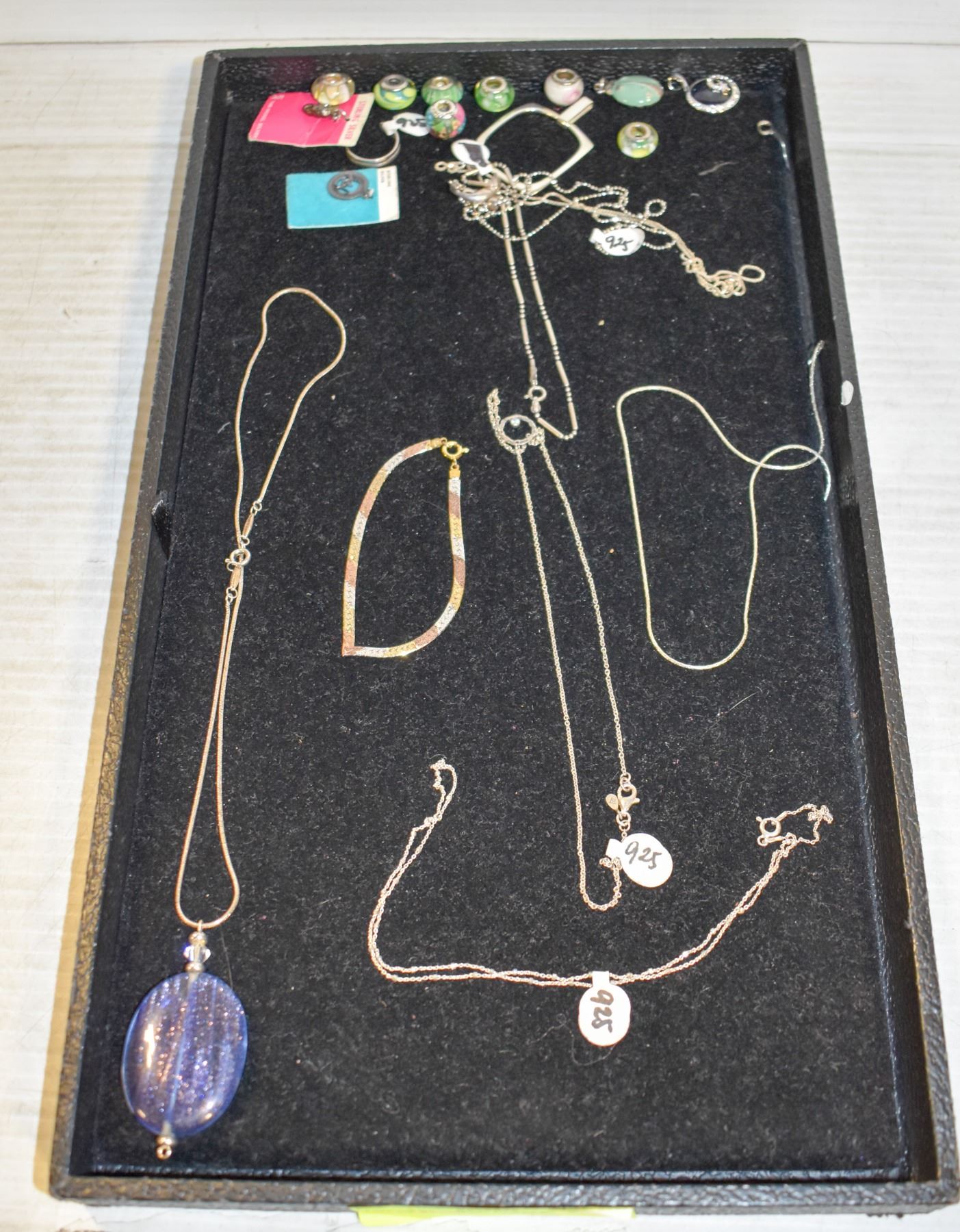 SILVER NECKLACES, (2) BRACELETS (1) TRI-GOLD .925 SILVER ITALY, (4) PENDANT'S, 2 STERLING SILVER CHARMS, TOE RING, (1) NECKLACE MADE IN SPAIN, PANDORA BEADS