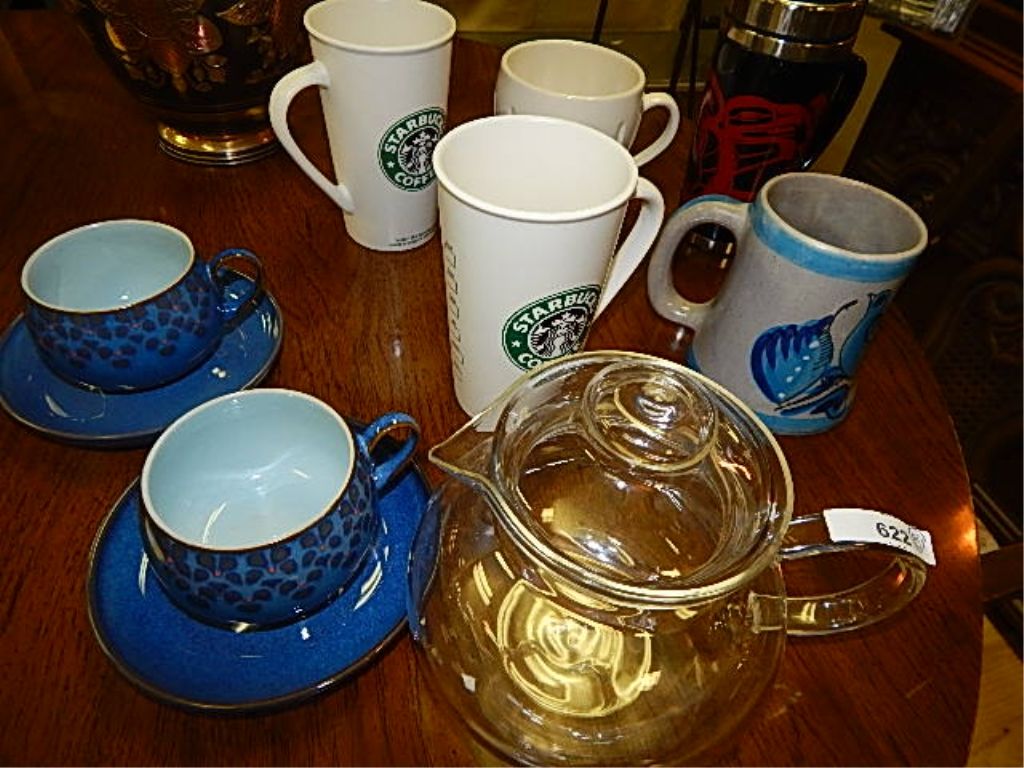 LOT OF STARBUCKS COFFEE CUPS, TEA POT AND OTHER