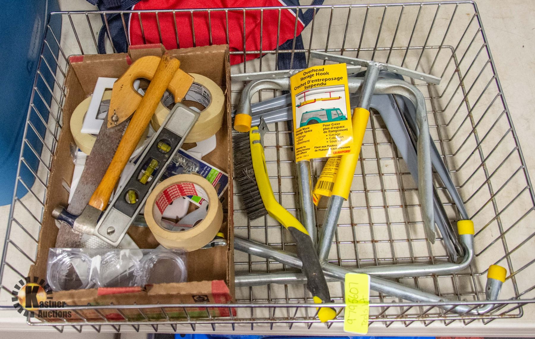 LOT OF STORAGE HANGERS, TAPE, TOOLS, ELECTRICAL