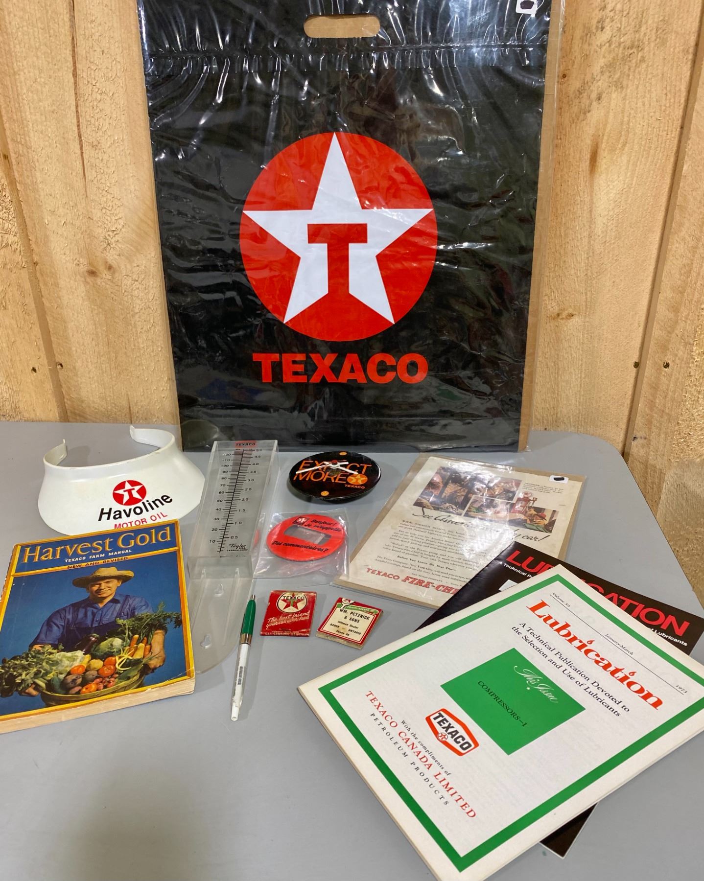 LOT OF TEXACO COLLECTIBLES - CLOCK, VISOR, MATCHES, ETC