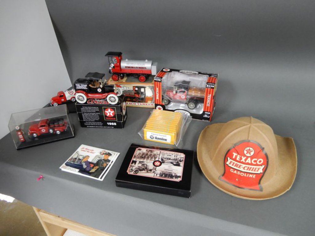 LOT OF TEXACO COLLECTIBLES HAT- 5 ERTL & GEAR BOX TOYS - CRAYONS- COLLECTOR BOX OF POST CARDS LOCATION: LOWER RIGHT