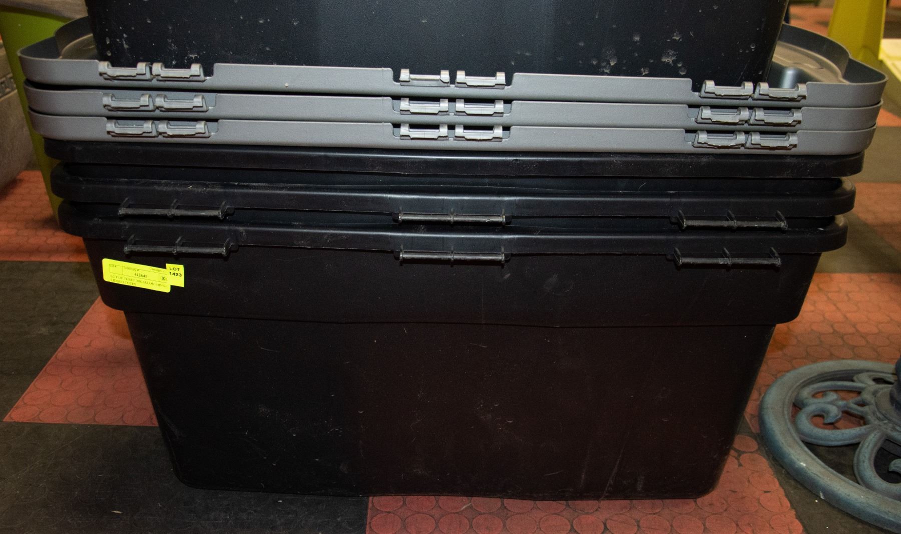 LOT OF THREE 38GALLON HINGE LIDDED TOTES