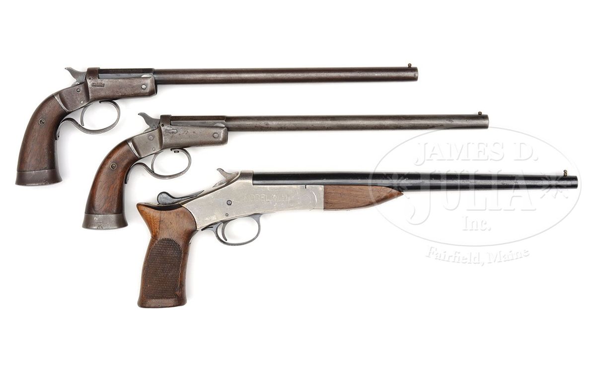 SN 40613/T15100/8648. This is a lot of three .410 single shot hand guns classified as "any other weapon". Gun #1 Cal .410 12 1/8" bbl. "J.STEVENS ARMS COMPANY / CHICOPEE FALLS, MASS U.S.A" SN "A8648" marked on bbl, which tips open by depressing a release stud on left side of frame. Registered as 8648. On this model, a lever is affixed to a screw which runs through to the trigger guard with the other end of the lever affixed to the bbl to keep it from tipping further than 45 degrees. The action is slightly loose but still serviceable. Gun #2 Cal .410 12 1/8" bbl. "J.STEVENS ARMS COMPANY / CHICOPEE FALLS, MASS U.S.A" SN "T15100" marked on bbl which tips open by depressing a release stud on left side of frame. On this model, a lever is affixed to a screw which runs through to the trigger guard with the other end of the lever affixed to the bbl to keep it from tipping further than 45 degrees. The action is this gun is slightly loose as well, perhaps less loose than the first but still serviceable. Bbls on both these guns are marked "410 GAUGE ONLY" on left side. Gun #3 was manufactured by Hibbard and is very similar in appearance to the larger single bbl shotguns manufactured by H&R. It is marked "HIBBARD" on the left side of frame and "MODEL WH" on the right side of frame, which is nickel plated. Bbl is marked "MADE IN USA 410 GA CHOKE". SN matches on bbl and receiver frame. Action closes very tightly. This weapon appears fully functioning and serviceable. CONDITION: #1 Less than 10% blued finish remaining and that only in the recessed areas and on hammer. Balance of metal parts being a pleasing smooth gray patina. Wooden grips are fine with some handling marks. Upper screw on left side of action is a incorrectly sized replacement and the slot of the screw head is deformed. Bore and chamber are excellent, shiny, and bright. Trigger pull is positive and crisp. Safety at partial cock works well. #2 This gun also has less than 10% blued finish remaining and mostly in the recessed areas and on hammer. Balance of metal parts being more of a smooth brown patina. Wooden grips are very good with only very few handling marks. Chamber is good. Bore needs a cleaning, but looks as thought it will clean up well, mostly shiny. Trigger pull is positive and crisp. Safety at partial cock works well. #3 Overall finish and appearance of blue parts is fine. About 90% bright bbl blue overall, with some scratches and area about 1" x 1/4" on the left side thinned to bare metal with some slight pitting and patina. Blued bbl release lever retains nearly all of it's deep lustrous finish with some pin prick corrosion. Nickled receiver retains about 90% of it's nickel with some oxidation and corrosion along the ridges and a couple of spots on the left side. Blued trigger guard is consistent with the bluing on the rest of the gun. Hammer retains about 20% of it's case color hardening. Wooden forend finish is mostly flaked off revealing a light colored wood. Hand grip has one significant gouge on the right side front bottom of the checkering about 1/4" in diameter. Top of grip shows a repair just below the lever where a 1-1/2" x 3/8" piece had broken off and then had been cut and squared off and glued back into place. The grip now appears to be completely serviceable. This is a nice grouping of single shot 410's which should be of interest to collectors. 4-48846 JWK33