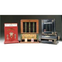 LOT OF THREE COIN-OP DISPENSERS. (1) A four-column one-cent match dispenser. Features nouveau style front tin litho panel on a mahogany cabinet. SIZE: 12” w. x 14 1/2” h. x 6 1/2” d. CONDITION: Glass door needs adjusting; working condition. (2) A three-column one-cent match dispenser by Griswald Mfg. Co., Rock Island, Ill. Painted metal construction with applied stars. SIZE: 10 1/2” w. x 14 1/2” h. x 5” d. CONDITION: Generally good, working condition; some surface corrosion to nickel-plated components. (3) Electrical shock one-cent coin-op. Paper marquee insert reads, “Electricity cures many ills.” Metal cabinet repainted. SIZE: 9” w. x 12” h. x 7” d. CONDITION: Non-professional restoration. PF 1-3640 (250-450)