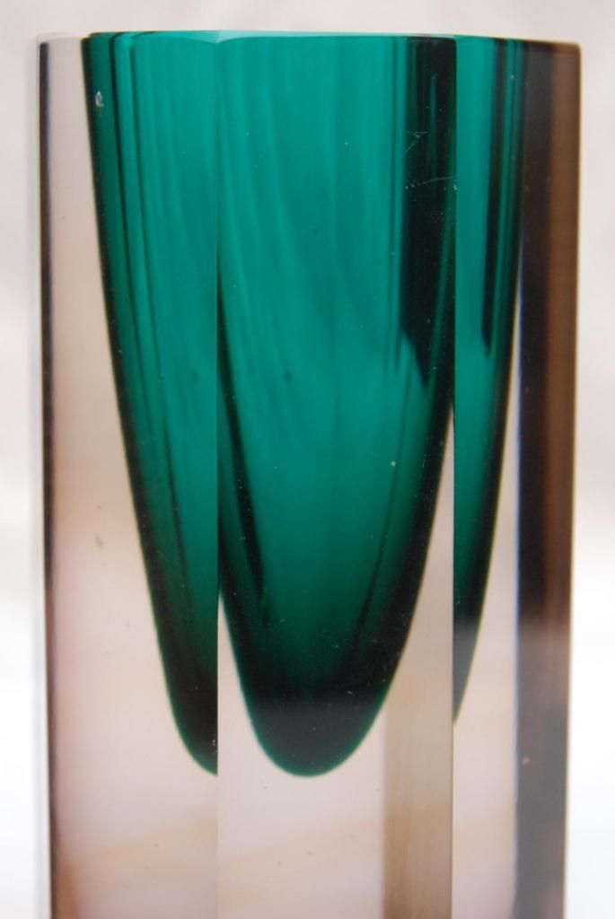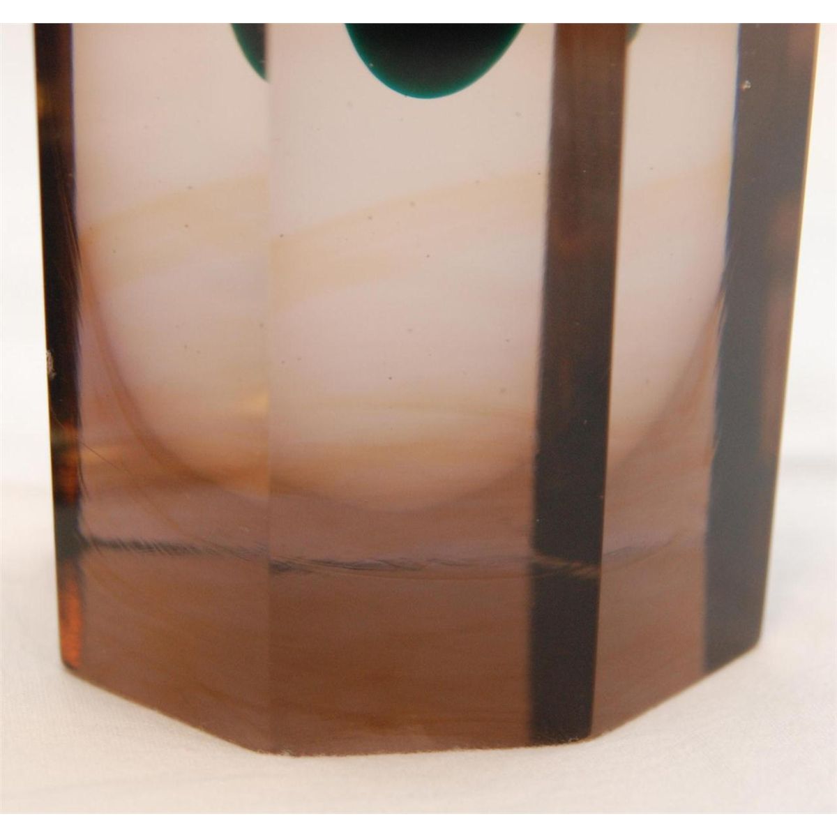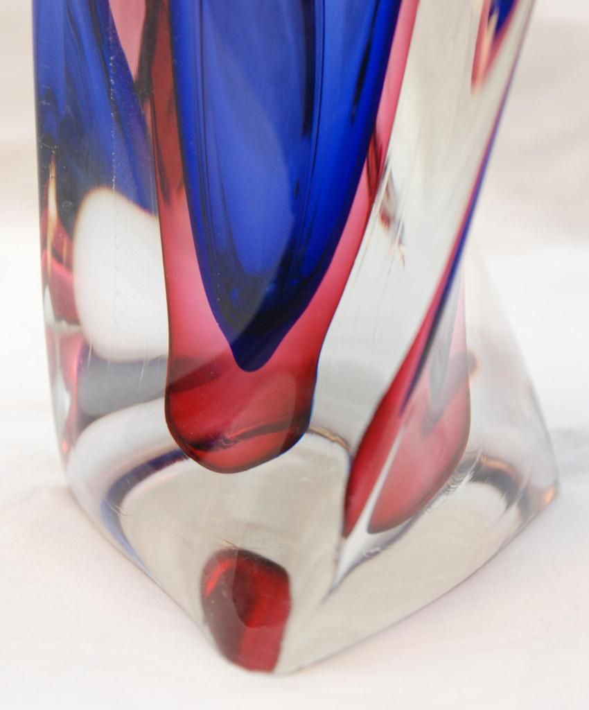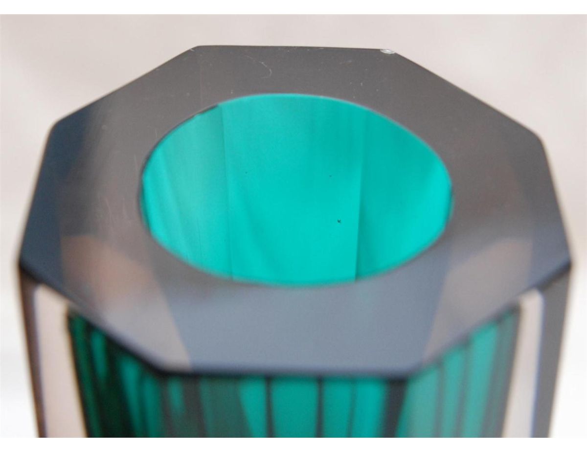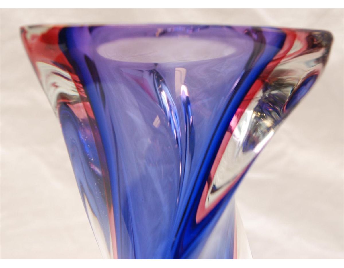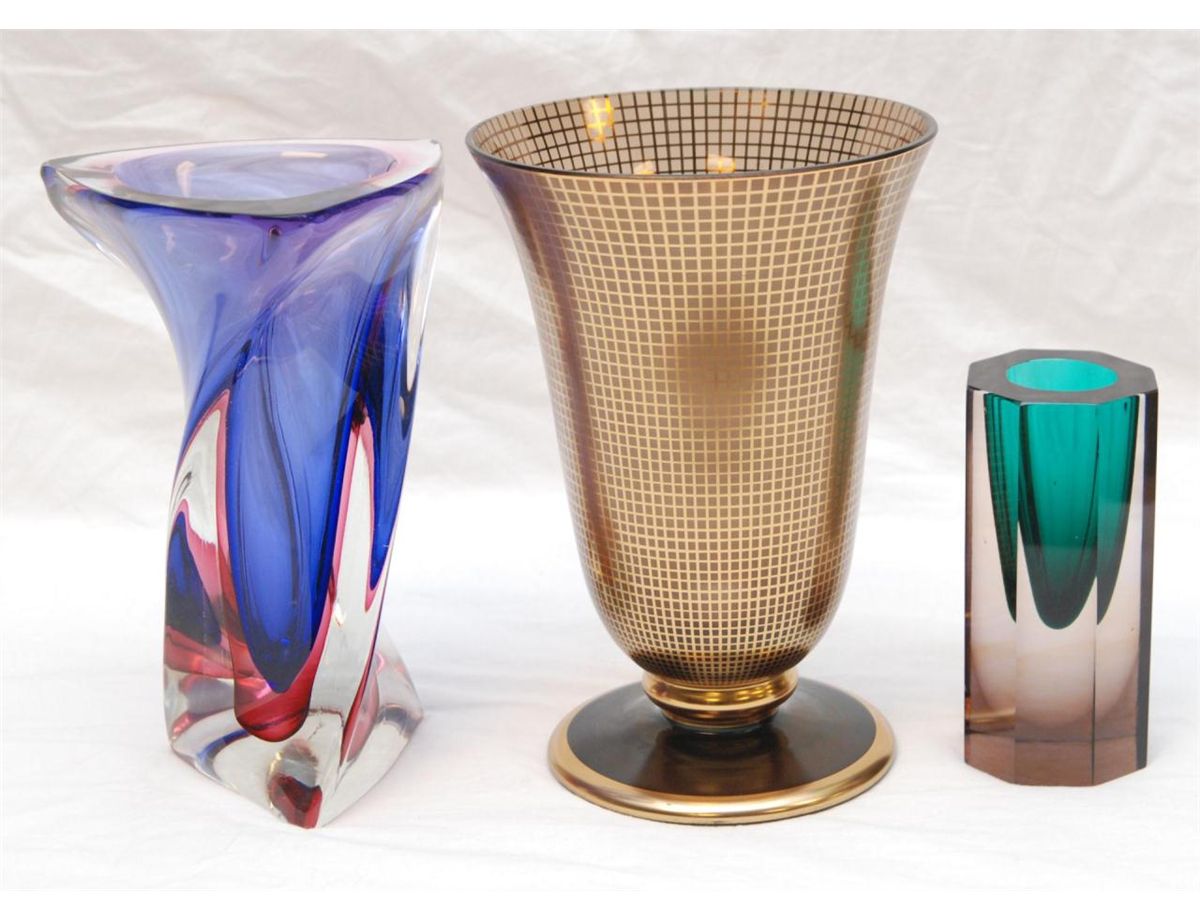 Lot of three contemporary art glass vases including a translucent brown vase, spiraled case with blue and red designs. Last is a cylinder with octagonal shape having a green interior. Largest measures 10 3/4" height (27.3cm). Total weight of 6.36 kilograms.