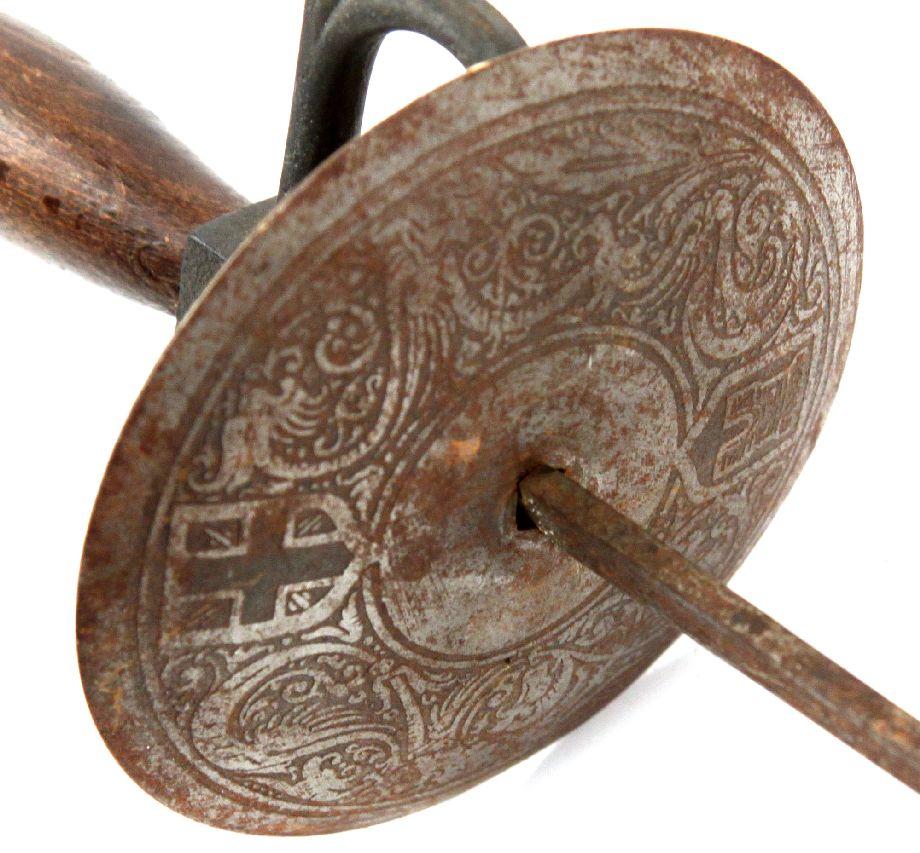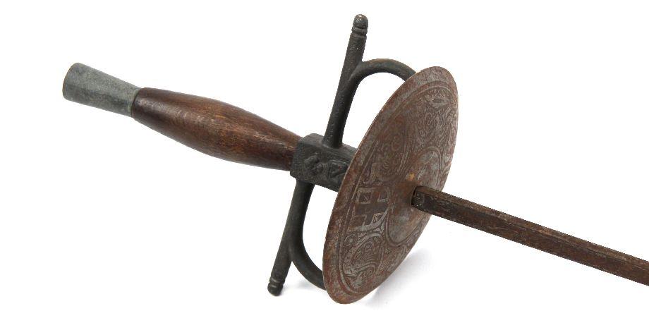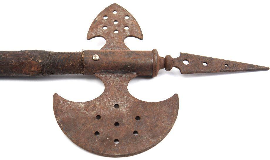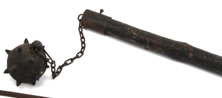 Lot of three decorative faux weapons. An Italian grip style fencing foil, with 35 inch blade, marked Toledo, Spain. Also, a wooden handled battle axe, with handle measuring 29 inches, and a mace. Surface rust on most.