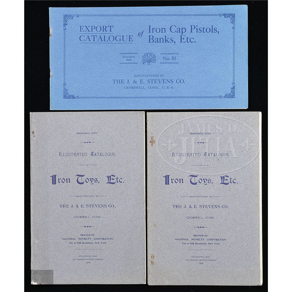 Two identical 1906 iron toy catalogs featuring 46 pages of still banks, safe banks, toy stoves, child's sad irons, cap guns, and page after page of beautifully illustrated mechanical banks. Also included in the lot is another J. E. Stevens catalog featuring 26 pages of mostly exotic cap guns and safe banks. Five mechanical banks are shown. SIZE: Largest 11" l. PROVENANCE: The Diane and late Steve Olin collection. CONDITION: Excellent. 13271-23