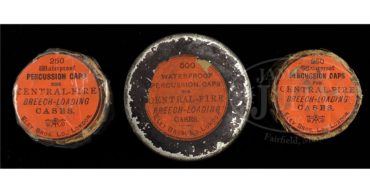 Two lacquered tins with partial mottled paper wrapping and orange & black label on tops. Labels read "250 / Waterproof / PERCUSSION CAPS / FOR / CENTRAL-FIRE / BREECH-LOADING / CASES" with the bottom line the Eley Bros. name & address. The third item is a lacquered tin for 500 primers identical to the first two, the only difference being the orange & black label is slightly larger with larger font and is marked for "500" caps. These are extremely rare accessories for a Thuer revolver, the companions to a box of orig cartridges being sold elsewhere in this auction. CONDITION: 1) Label is completely intact with only one small spot of soil. Paper wrapping is about 60% intact and is very brittle. Caps are extremely fine. 2) Virtually identical in condition of the paper wrapping with light soil & wear on the orange label. 3) 500 rd tin retains about 60% orig lacquer with the label having lost about 15% around the edges and showing moderate soil. 4-49099 JR374