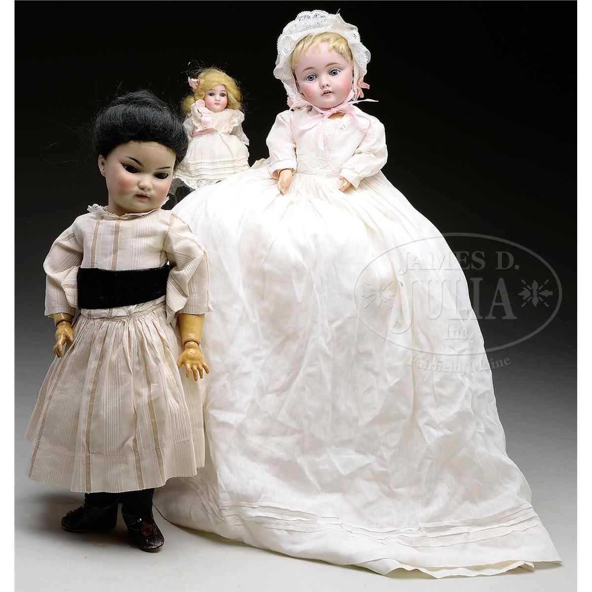 The largest is an olive tinted bisque head incised "S & H 1199 DEP 6" with brown glass sleep eyes in almond shaped slanted eye cuts, arched eyebrows, open mouth with four upper teeth, pierced ears, on original fully jointed wooden composition body wearing original black mohair wig in up-swept Asian style. Together with a Kestner incised "143" with blue glass sleep eyes, open mouth with two upper teeth, on original fully jointed wood and composition body with remnants of a paper label from the G. A. Schwartz store in Philadelphia. She has her original blonde mohair wig and christening dress could be original. Last is a all bisque German doll with one piece head and torso, blue glass sleep eyes, open mouth with four upper teeth, bisque arms jointed at the shoulders, and bisque legs jointed at the hips with molded and painted shoes and stockings. SIZE: Tallest 15" (38 cm) (Oriental doll). 5-1/2" (14 cm) (all bisque). CONDITION: Overall very good. Minor color loss on right cheek and upper lip of Kestner. 1-13167