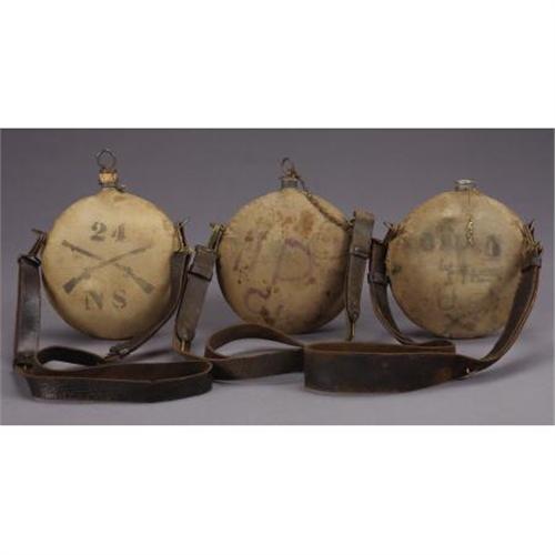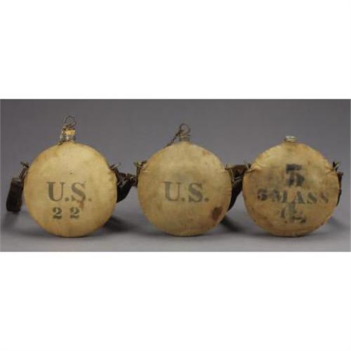 <B>LOT OF THREE INDIAN WARS STYLE U.S. REGULATION CANTEENS - </B></I><BR> 136: Canvas cover stenciled in black ink, “U.S. 22” on one side and a pair of crossed rifles with “24” on top and “NS” on bottom on reverse. Original canteen plug and shoulder strap present.<BR><BR><B>Condition:</B></I>Canvas body in excellent condition, medium to light staining. Original black shoulder strap is supple with both leather keepers intact.<BR><BR> 211: Canvas cover stenciled in black ink “U.S.”. Reverse has six large hand inked letters I can't accurately describe. Original shoulder sling and canteen plug intact.<BR><BR><B>Condition:</B></I>Canvas body intact, dirty and stained. Plug cord has losses. Brown leather shoulder strap evidences a few tears and is generally scuffed overall. Both leather keepers intact.<BR><BR>462: Canvas cover stenciled in black ink “5”, “5 MASS”, “42” on one side. Reverse is primitively hand printed in black with ink several indecipherable letters along with a “U.S.” and crossed sabers.<BR><BR><B>Condition:</B></I> Canvas cover is intact with considerable soiling and staining. Plug missing but chain is present. Shoulder sling is of the type more commonly associated with a haversack. Both keepers intact.<BR><BR><b>Shipping:</b> Miscellaneous Collectibles, Smal (<a target="_blank" href="http://www.heritageauctions.com/common/shipping.php">view shipping information</a>)