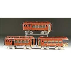 LOT OF THREE LIONEL STANDARD GAUGE PASSENGER CARS. Early cars are embossed on bottom “LIONEL MFG. CO. N.Y.” Two baggage cars #181 and an observation car #182, all painted bright maroon, brass trim, doors in olive green. Lettering over the windows reads “NEW YORK CENTRAL LINE,” and all lettering is very sharp. CONDITION: Quite a few paper marks on all cars, chips and scratches, paint is very bright. EC 1-4352 (400-550)