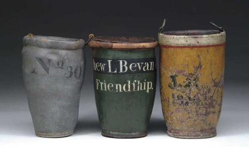 LOT OF THREE PAINTED LEATHER FIRE BUCKETS. All with damage. One in green with "Mathew L. Bevan & Co. Friendship". Another in gray with "No. 30". Last one "J. R.". SIZES: Approximately 12" to top of rims. CONDITION: As noted above. 9-27878