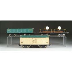 LOT OF THREE STANDARD GAUGE 500-SERIES CARS. Lot of Lionel cars includes #520 search light car on a black frame with terra-cotta base, an early color; #512 gondola car on black frame with green sides; #514 refrigerator car in a cream color with turquoise roof and black frame. CONDITION: Overall good plus, minor chips and scratches. EC 1-4385-1213 (175-325)