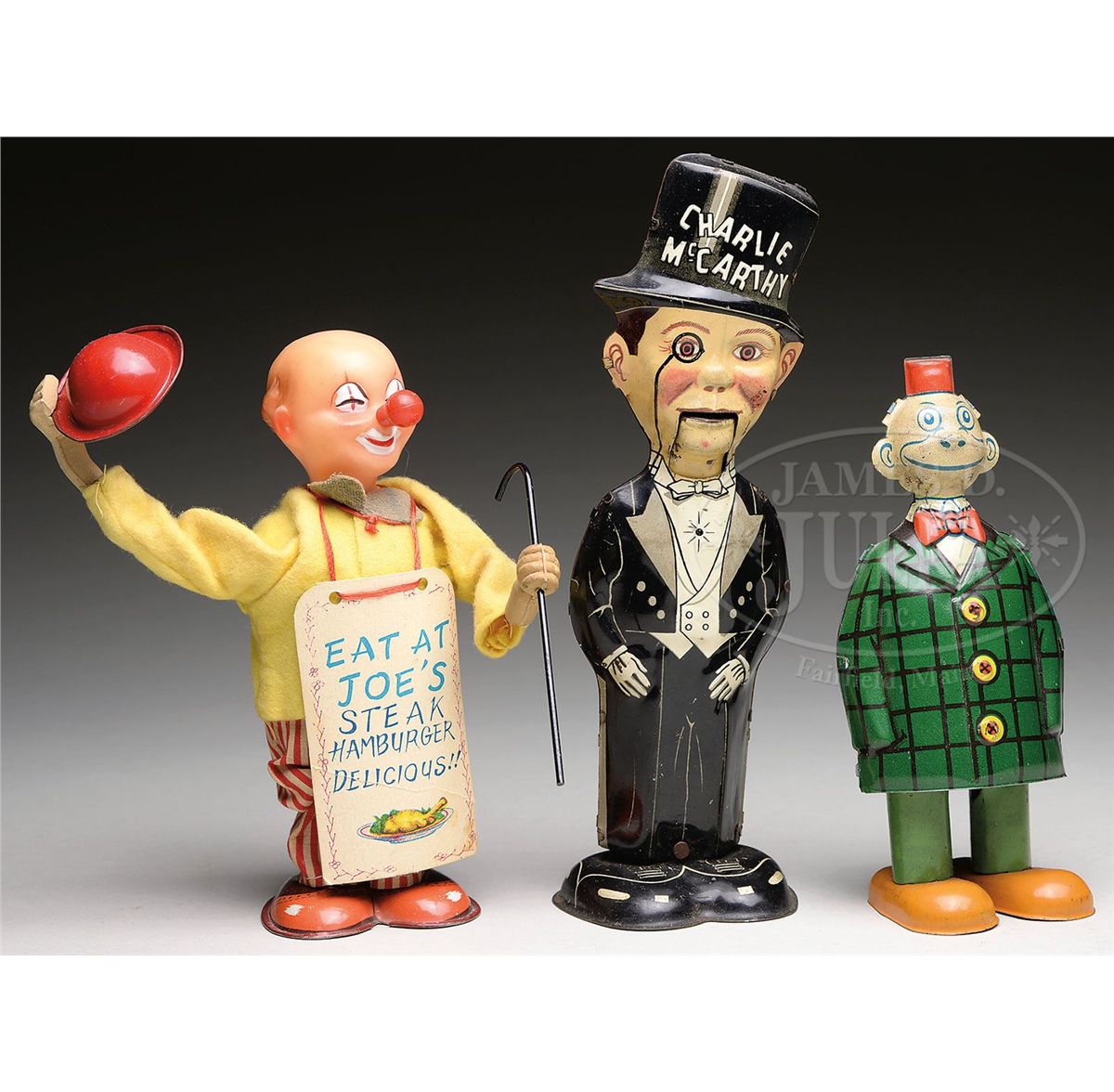 1) Pre-War Happy Hooligan by Chein. Windup mechanism sends comic character waddling forward. 2) Japanese clown toy carries sandwich sign reading "Eat At Joe's". Lots of action as figure tips hat, wiggles nose, raises walking cane, and raises and lowers body. By T.N. Japan. 3) Marx Charlie McCarthy Tin Windup Walker. Edgar Bergen's character waddles side to side as mouth moves up and down. SIZE: Tallest 8-1/2". CONDITION: Very good plus. All mechanical functions working. 1-13279