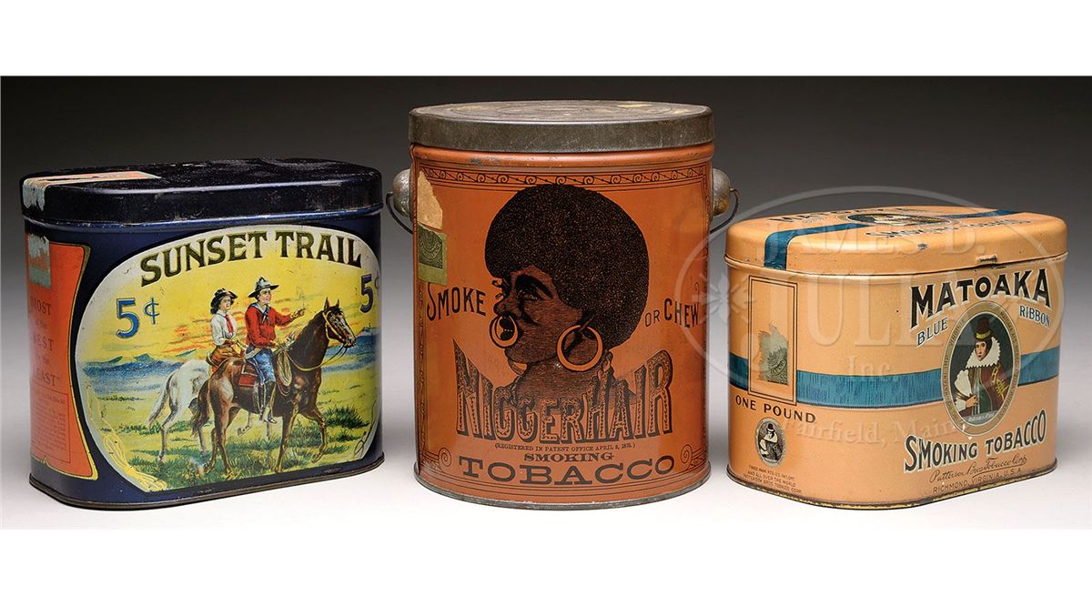 1) Sunset Trail cigar tin, blue version; 2) Matoaka Blue Ribbon Smoking Tobacco tin; 3) Niggerhair Smoking Tobacco pail. SIZE: 1) 6" x 4" x 5-1/2"; 2) 6-1/8" x 4-1/8" x 4-1/2"; 3) 5-3/8" dia x 6-5/8" t. CONDITION: 1) Very good to excellent with a small paper distributor label stuck on the back; 2) Very good to excellent; 3) Near excellent. 1-13226-45