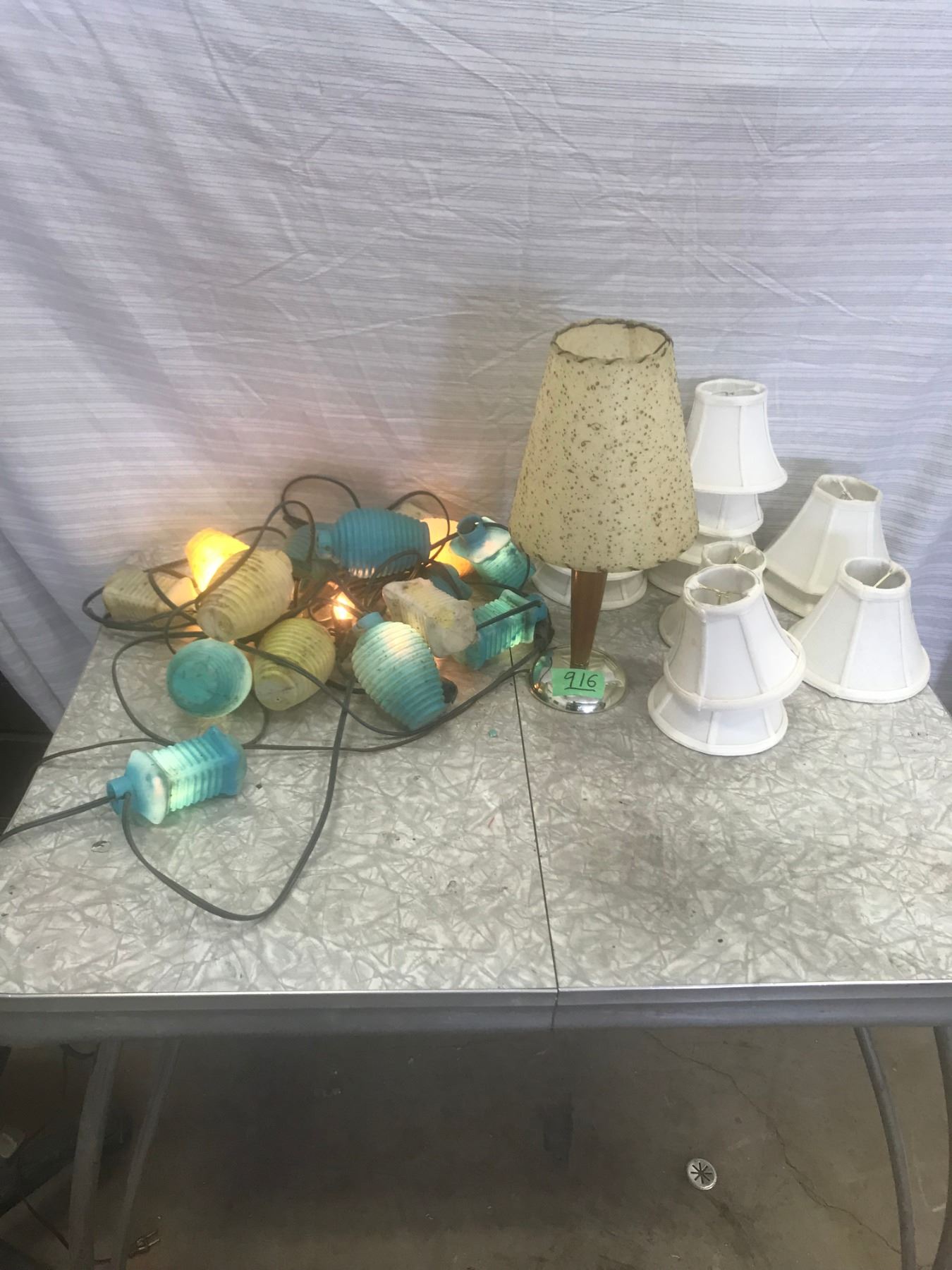 LOT OF TIKI LITES, ART DECO LAMP AND 15 MINI LAMP SHADES