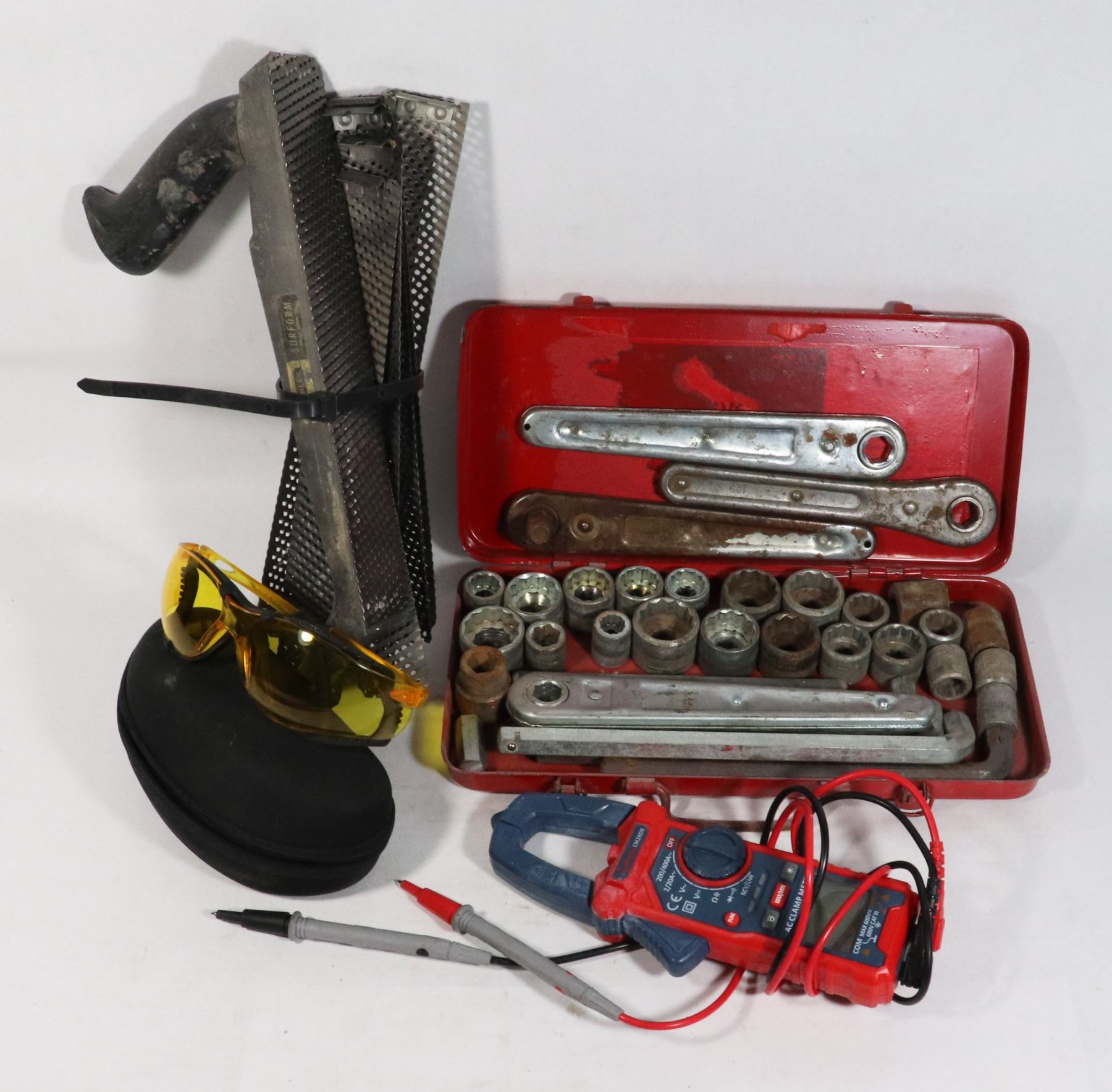 SAFETY GLASSES IN CASE, VINTAGE RATCHET/ WRENCH SET AND MORE