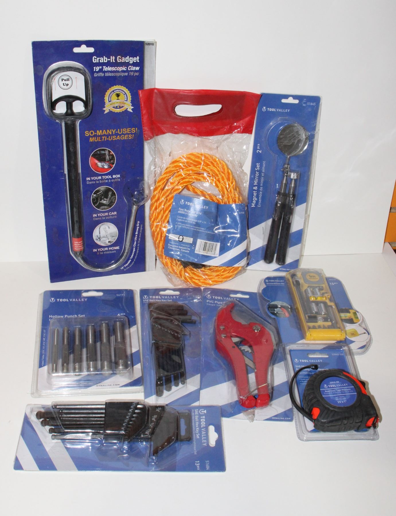 LOT OF TOOLS INCLUDING GRAB IT GADGET, TOW ROPE,