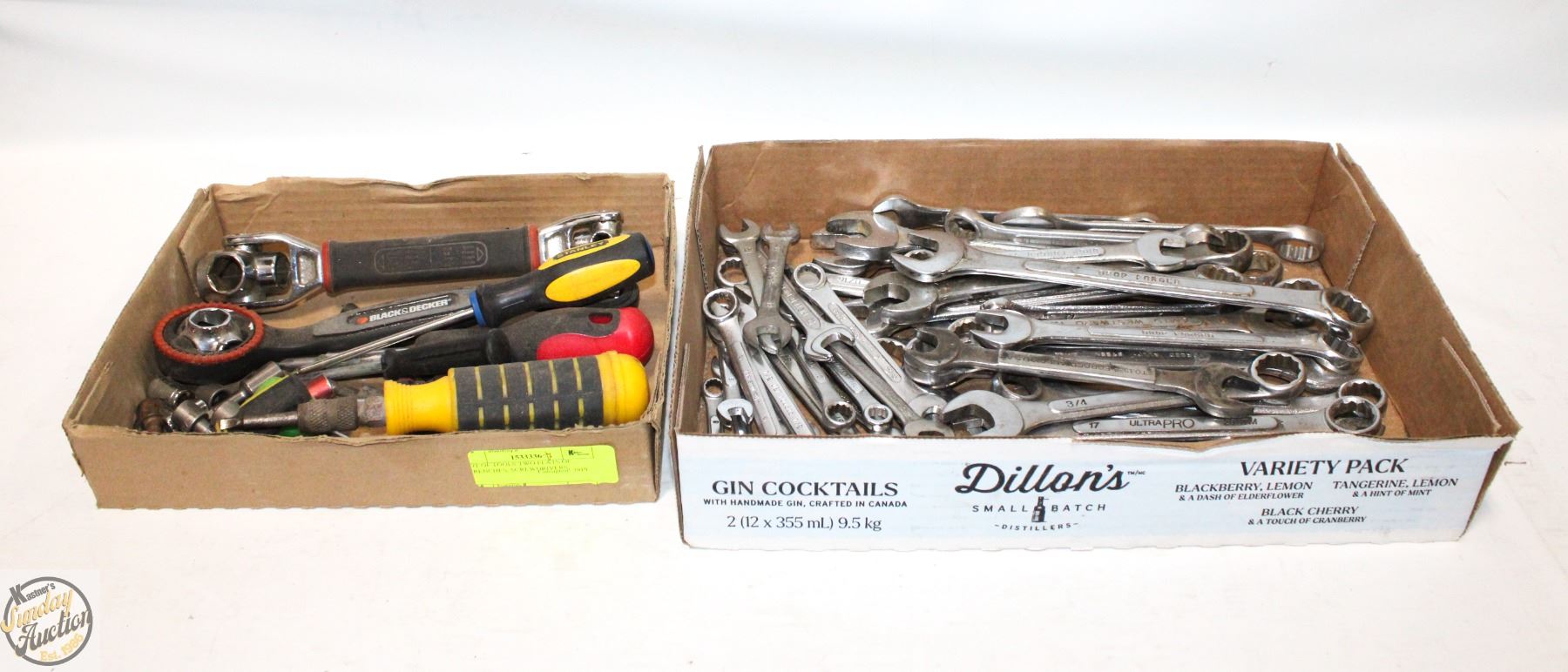 LOT OF TOOLS TWO FLATS OF WRENCHES, SCREWDRIVERS,