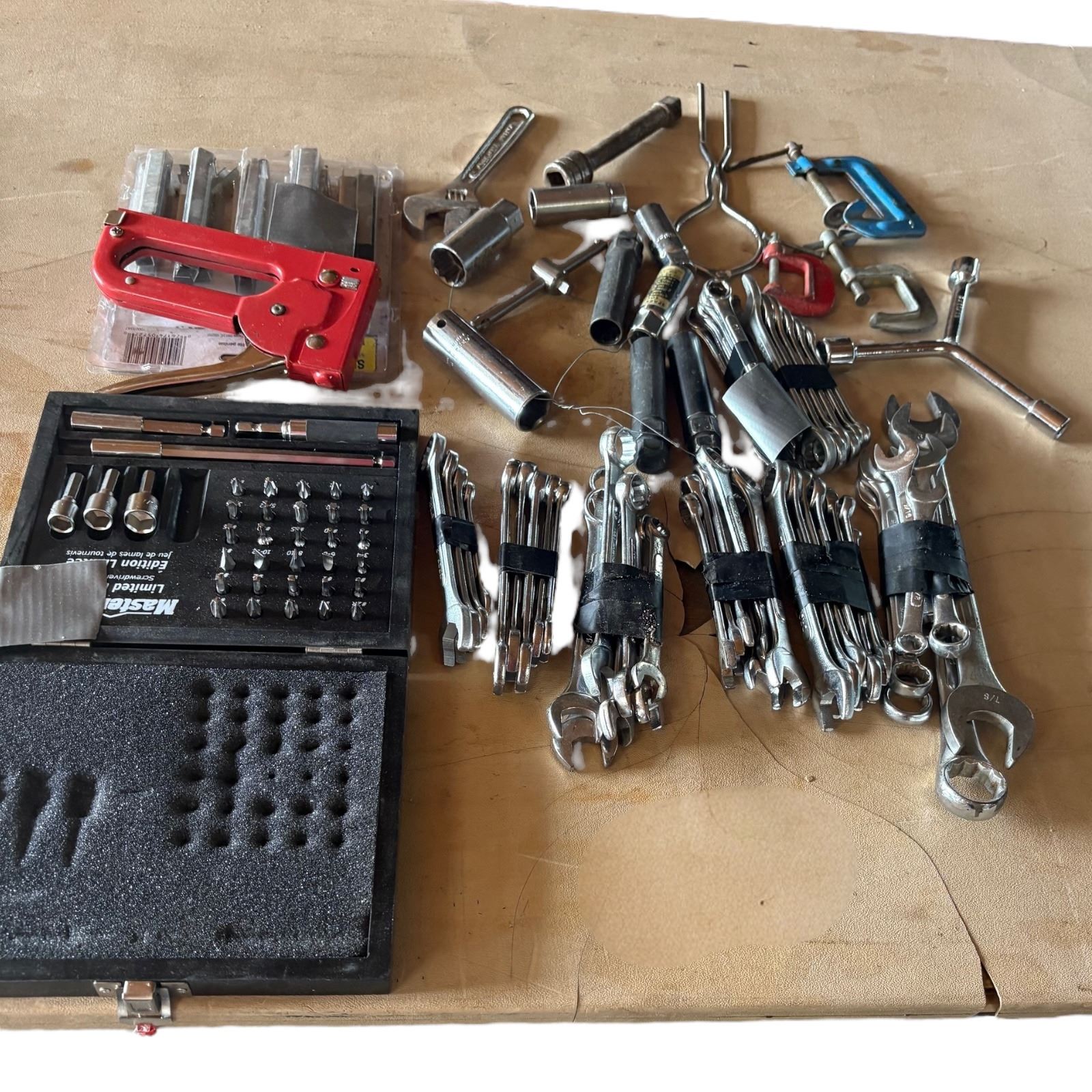 Includes sockets, wrenches, staple gun and staples, drill bits and more - check photo
