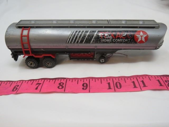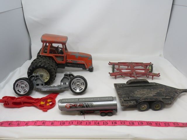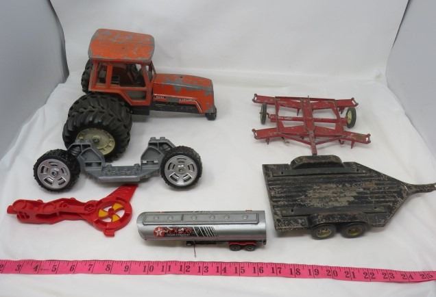 LOT OF TOYS AND PARTS (VINTAGE) *TRACTOR, 2 X TRAILERS, AND TEXACO TRAILERS ARE DIE CAST*