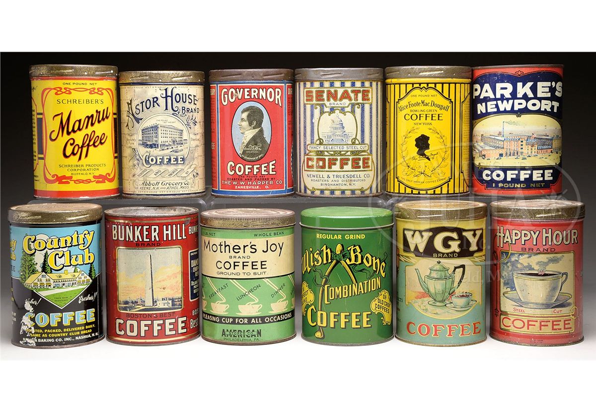 1) Parke's Newport; 2) Alice Foote MacDougall Bowling Green Coffee; 3) Bunker Hill Brand; 4) Mother's Joy Brand; 5) Wish Bone Combination; 6) WGY Brand; 7) Senate Brand; 8) Astor House Brand; 9) Happy Hour Brand; 10) Manru Coffee; 11) Governor Coffee; 12) Country Club Coffee. SIZE: 1) 6"; 2) 6"; 3) 6"; 4) 5-5/8"; 5) 5-3/4"; 6) 6"; 7) 6"; 8) 6"; 9) 6"; 10) 6-1/4"; 11) 6"; 12) 6". CONDITION: 1) Very good; 2) Near excellent; 3) Very good; 4) Very good; 5) Good-very good; 6) Near excellent; 7) Good-very good; 8) Very good-excellent; 9) Very good; 10) Very good-excellent; 11) Very good-excellent; 12) Very good. 1-13226-43