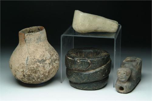 LOT OF TWENTY-SEVEN PIECES OF MISCELLANEOUS INDIAN ARTIFACTS. Including small pottery water bottle, half prehistoric sharks tooth, maul grooved celts, two discoidals, and a number of pipes. CONDITION: Broken to good. 9-25984-25 The Tennessee Collection of Prehistoric Indian Artifacts from the Allen Graves Estate. SPECIAL NOTE: We do not regularly sell Prehistoric Indian stone artifacts and therefore have very little experience and no expertise in this area. All of the following lots have come from the Collection of the Late Allen Graves of Tennessee. The collection was inherited some years back by his daughter, who now lives in Maine. This collection was consigned to us directly from her. We employed someone to generally identify styles and types, but as stated above, due to our lack of expertise in this field, we can not guarantee the age or origin of the following pieces. We are relying on you, the buyer, to determine to your satisfaction the origin and age of each item in the collection.