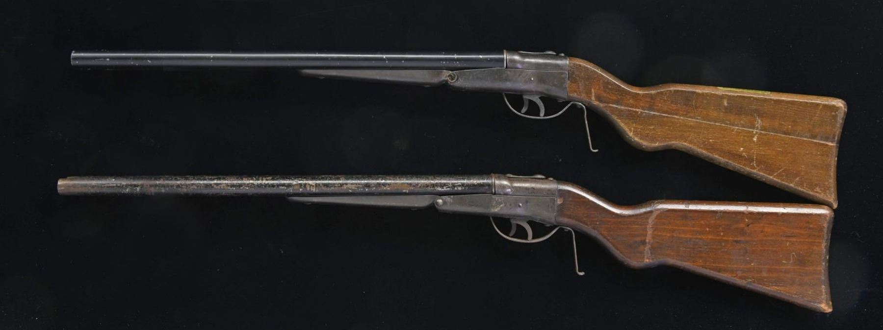 This lot consists of two toy SXS shotguns. One has AH Fox markings on the underside of the frame. The other shotgun frame has no discernable markings but the top of the comb is marked w/ a Fox mfg. label. Four cartridges are present w/ two in each gun. Slab wood stocks. CONDITION: both shotgun stocks show scattered dings, flaking varnish, crazing & handling wear. Shotgun w/ Fox receiver marking has separating bbl. seam & heavy flaking enamel. Shotgun w/ stock marking shows scattered lighter flaking. Both shotgun frames are turning gray w/ scattered oxidation. (02-21155/MJC). $300-500 for lot.