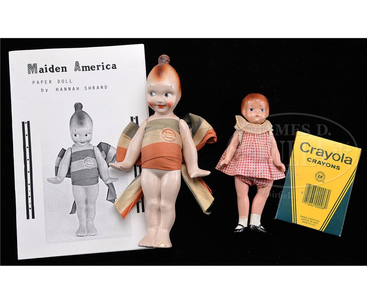 Lot consists of a "Maiden America" still bearing its tricolor ribbon bow and paper sticker on torso as well as an additional sticker on the bottom of the foot. Accompanied by a booklet from 1984 explaining that this doll was made in New York City from 1915-1917, and that is 1916 the doll was given as a bonus for buying War Bonds. Accompanying her is a Wee Patsy with one piece head and torso and separately strung arms and legs with painted shoes and socks. Wearing original clothing. SIZE: "Maiden America" 8" (20 cm), Wee Patsy 6" (15 cm) CONDITION: Both are very good. 1-13312