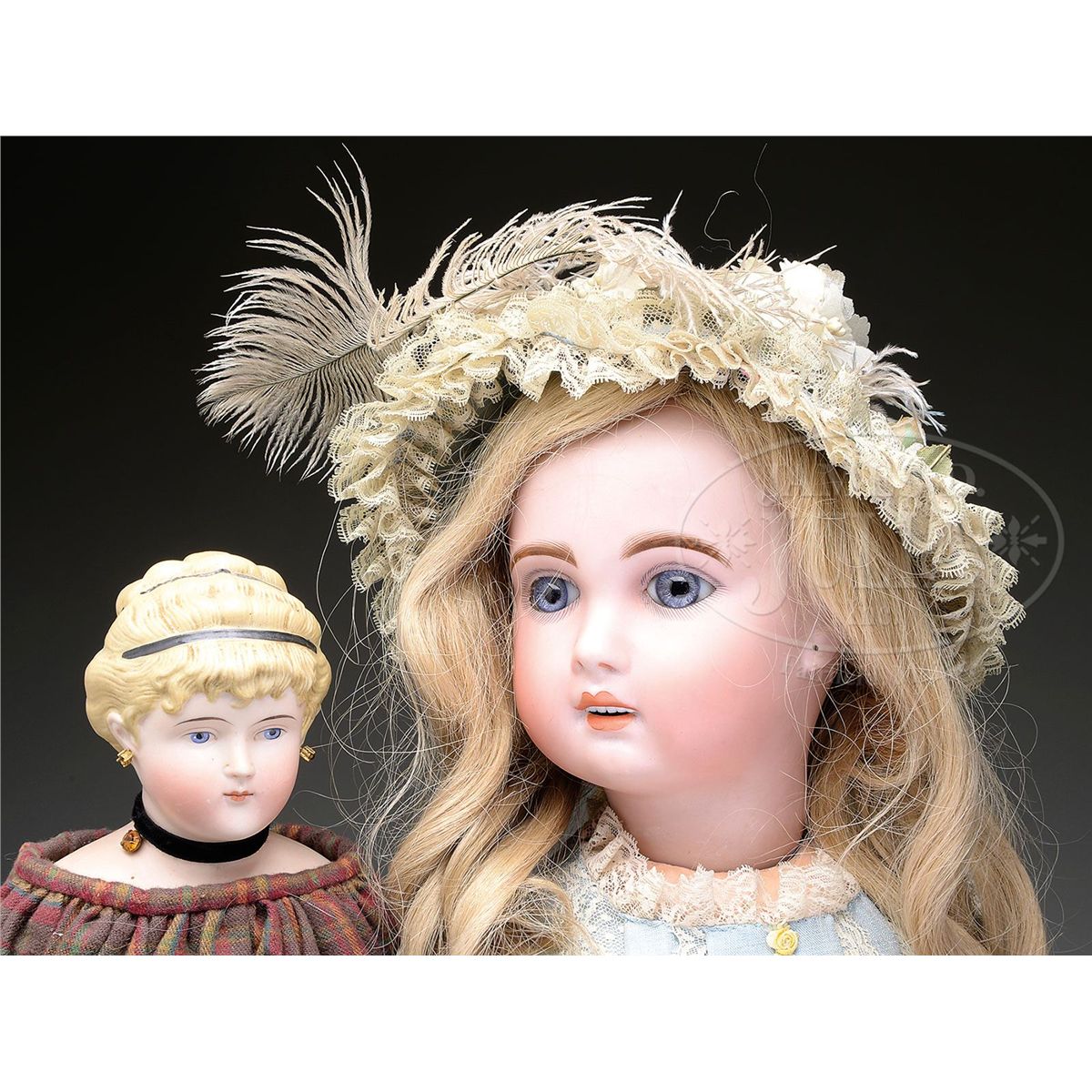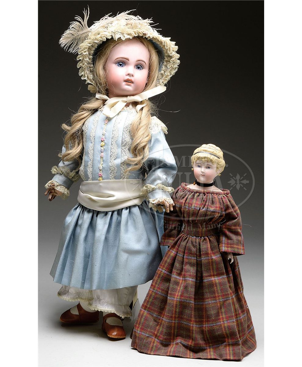 The larger of the two is a French bisque Jumeau incised "1907 12" and has lovely blue paperweight eyes, open mouth with four upper teeth, pierced ears, on the original fully jointed French wood and composition body. She has been appropriately redressed in pleated blue 1890s style dress and newer brown leather shoes and replacement human hair wig. Also included is a German molded bisque shoulder head doll incised on the back of the shoulder "1030 No. 8". She has lovely cafe au lait windblown hair pulled up into a bun in back with detailed hair comb and comb marks. She is on an old muslin stuffed body with white kid leather upper arms with bisque forearms. Dressed in a floor length plaid pleated wool dress. SIZE: Jumeau 27" (68 cm). Parian 17" (43 cm). CONDITION: Jumeau's body has typical wear and paint peeling, especially on fingers. Slight red line on outer surface only on forehead, not a damage. Parian head very good, some patching on body. 1-13159