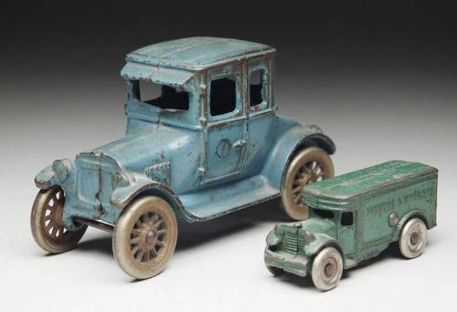 LOT OF TWO C.I. VEHICLES. 1) Dent Coupe, a very scarce toy with blue with nickel plated spoked wheels. SIZE: 6-1/4" l. 2) Green moving and storage van with cast iron disk wheels. SIZE: 3-3/4" l. CONDITION: Very good plus. 1-5342 MC