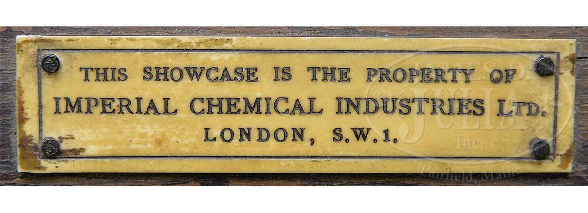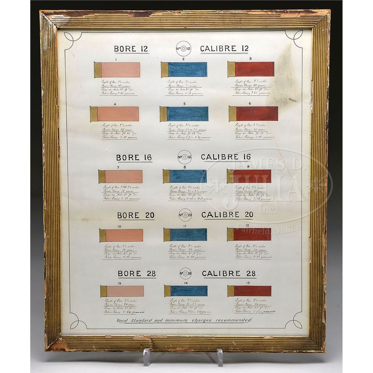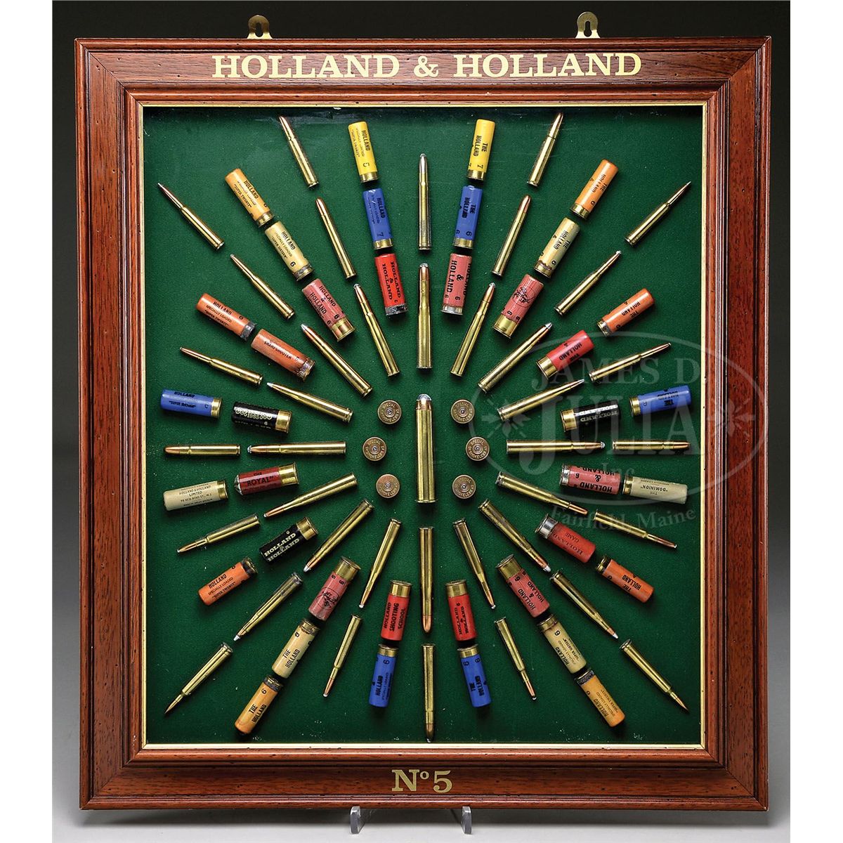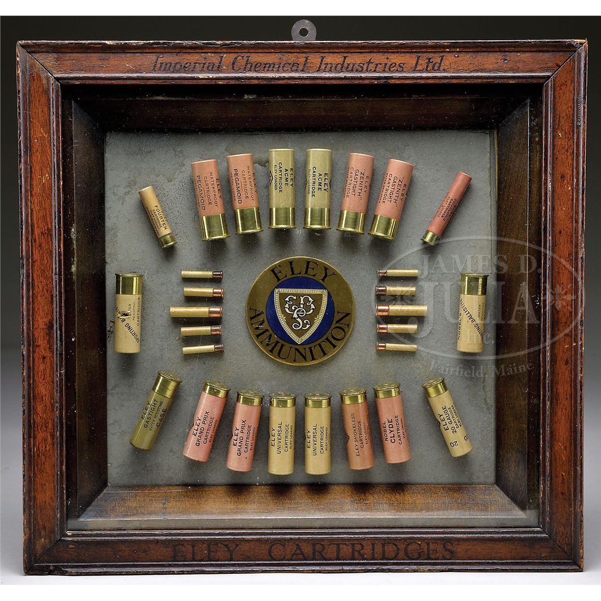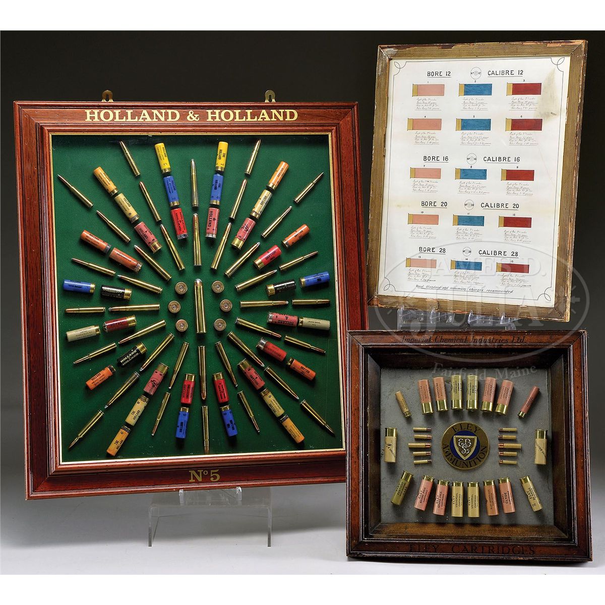 NSN. No. 1: Early 17" x 16" walnut shadowbox displaying Eley shotgun ammunition in most all gauges, including .410, and interesting rimfire cartridges are mounted around central medallion inscribed "Eley Ammunition". Outer frame of box is inscribed "Imperial Chemical Industries Ltd." on top edge and "ELEY CARTRIDGES" on bottom. A celluloid tag tacked to top is marked "This showcase is the property of Imperial Chemical Industries, Ltd. London, S. W. 1." CONDITION: Fine. Color of cartridges is faded from light, one cartridge has compression. Glass has scratch. Frame has orig old varnish which is crazed. Back is reinforced with thin mahogany plywood. No. 2: Hand colored broadside in 15-1/2" x 19-1/2" frame is marked "Usual Standard and Minimum Charges Recommended" at bottom, and showing different 12, 16, 20, and 28 bore cartridges and their usual loads in both English and German, in old reeded frame. CONDITION: Broadside has some foxing and discoloration. Frame has considerable loss and chipping to reeding. Re-backed. No. 3: Holland & Holland Sesquicentennial cartridge board marked "Holland & Holland No. 5" on distressed walnut frame with gilt trim. Fine array of old and new Holland & Holland paper and plastic shot shells interspersed with brass rifle cartridges, radiate from central group of shotgun brass head stamps and Holland & Holland 700 bore rifle cartridge, on green felt background. CONDITION: Very good, frame with all of its finish. Shot shells show considerable corrosion, especially at heads, with discoloration of paper. Rifle brass also shows some corrosion. A very attractive display. CONDITION: As above. 4-48284 MGM147