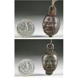 LOT OF TWO CHINAMAN TOY CAP BOMBS. Manufactured by Ives. (1) BOMB12. Chinaman with a single face and cap on head. SIZE: 1-3/4" h. (2) BOMB11. Chinaman with a face on both sides. SIZE: 1-5/8" h. Mouth opens for placement of cap on both. CONDITION: Very good plus. MC 1-4165 & 1-4178 (200-300)