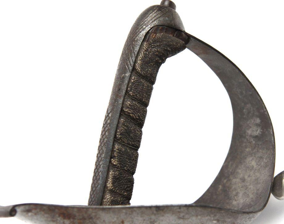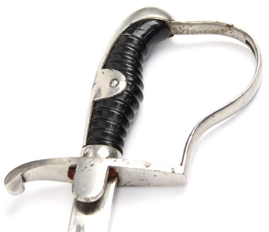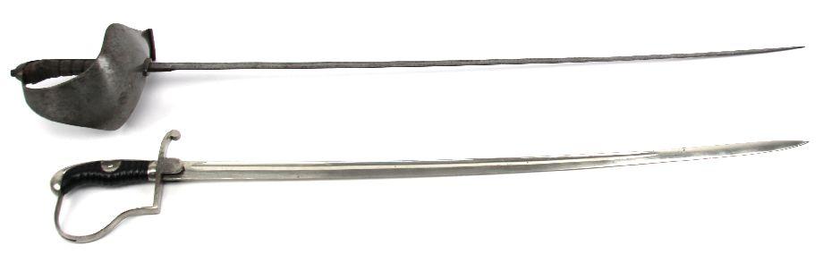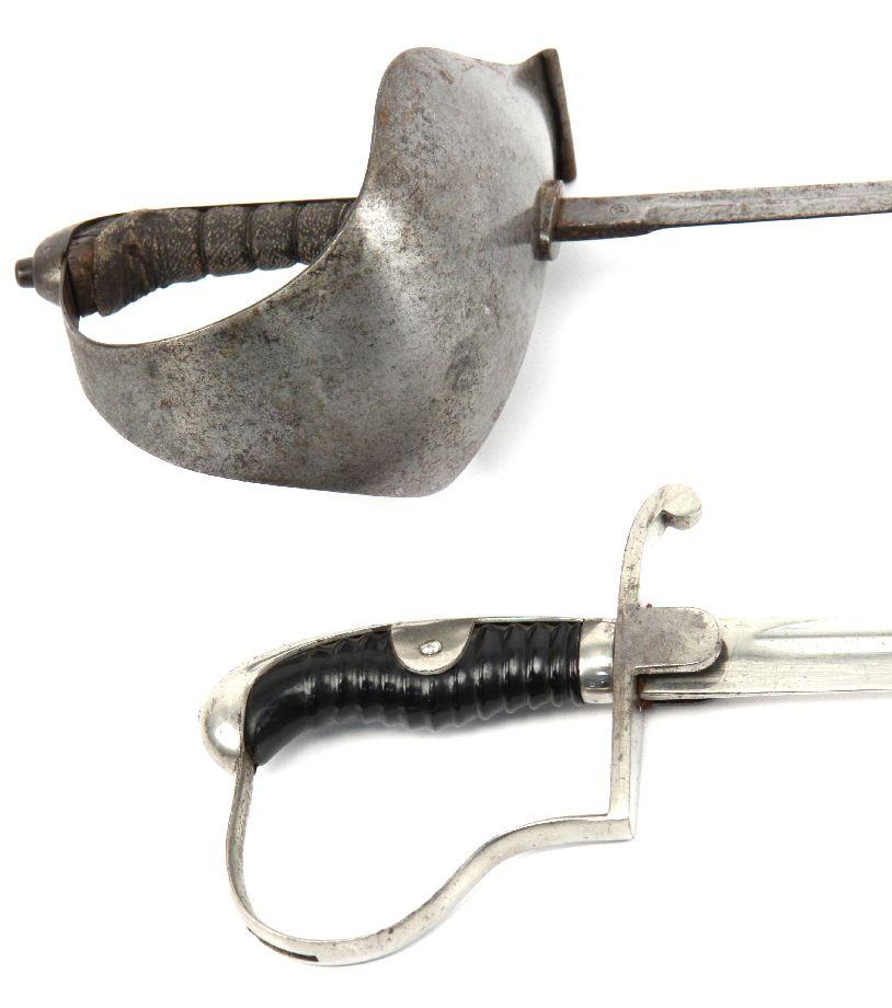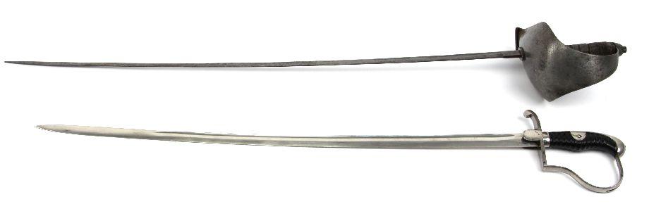 Lot of two European swords. One appearing to be Swiss in style, with 35 inch single fuller straight blade, and steel cup guard on hilt. Marked "GG" on ricasso. Some age patina and pitting to blade. Also, a German style sword, with "P" guard hilt, celluloid grip, and 31 inch, single fuller, unmarked blade. Bot in good condition, with no scabbards.