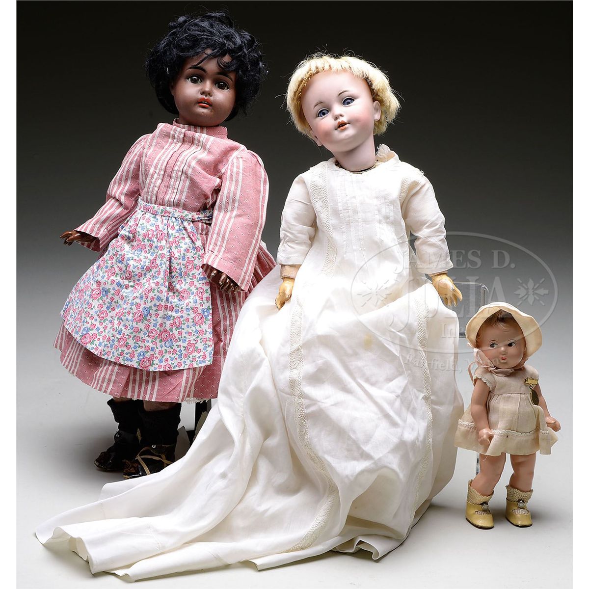 Larger German doll is a brown bisque Kestner simply incised "Made In Germany" and has brown glass sleep eyes, open mouth with four upper square teeth, well painted upper and lower lashes and multi-stroke eyebrows, on the original fully jointed wood and composition body whose color well matches the head. Smaller bisque doll is incised "S & H 1279 DEP GERMANY 6" and has blue glass sleep eyes, open mouth with two upper teeth, deep dimples, and is on the original fully jointed wood and composition body. In addition is a Madame Alexander Dionne Quintuplet with original clothes and with her name pin marked "Yvonne". SIZE: Tallest 17" (43 cm) (Kestner). Smallest 7-1/2" (19 cm) (Madame Alexander). CONDITION: Overall very good. Neck socket of torso of S & H doll has missing gesso. 1-13168