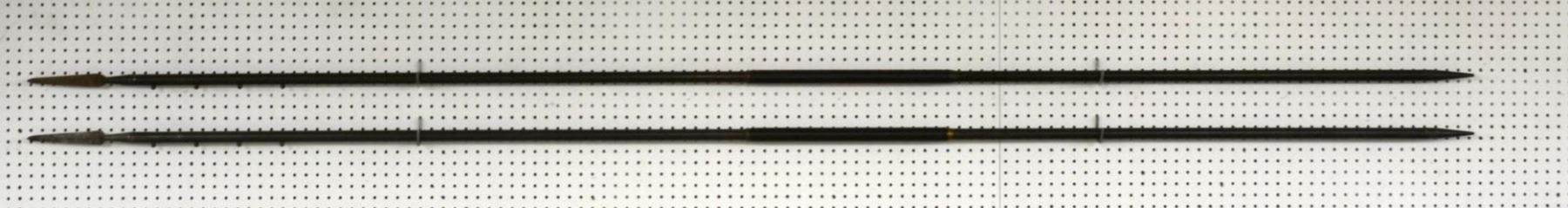 This lot consists of two German M1895 Cavalry lances that measure 126" each. Both lances are maker marked by Weyersberg Kirschbaum Solingen. 8730 & 12618. The visible numbers on both are matching & one is marked "Modelo Argentino" indicating later Argentine use. Both lances have four studs for mounting pennants. CONDITION: the tips of both are a dull gray patina w/ oxidation. The bodies retain much of their finish w/ some handling wear & light oxidation. (02-16434/MJC). $400-600.