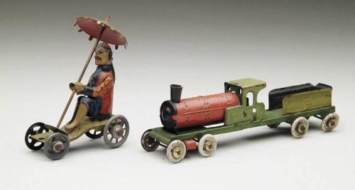 LOT OF TWO GERMAN PENNY TOYS. Consisting of train with tender lithographed in red and green with white wheels and a china man in cart with revolving parasol. China man SIZE: 3" l x 33/4" h. Engine SIZE: 53/4" l x 13/4" h. CONDITION: Train is in very good condition and china man is in near mint condition. 1-5330 MC
