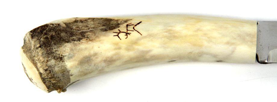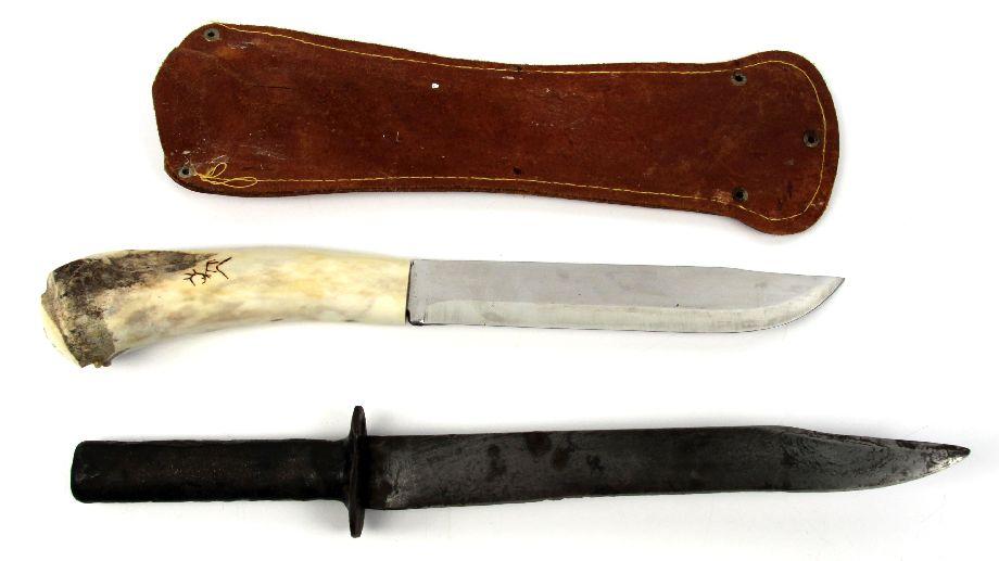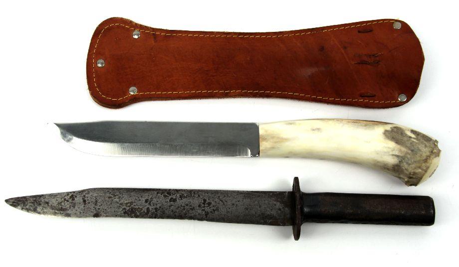Lot of two hand made custom knives. One 19th century 19th century hand fashioned knife, with iron handle and grip, and 9 inch clip point blade. Dark patina on blade, no markings. Also a modern stag handled knife with 7 inch blade, and no makers mark. Symbol marked on right side of handle. very good condition.