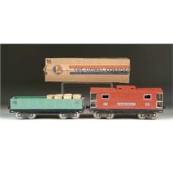LOT OF TWO LIONEL STANDARD GAUGE 200-SERIES CARS. Late color all red #217 caboose with nickel trim and black frame in original box which is missing one flap; late color #212 gondola car in light green on a black frame with nickel trim, carrying a barrel load, in completely intact original box. CONDITION: #217 car has some scratches and chips but overall very good; #212 car is near excellent. EC 1-4377-1215 (300-600)